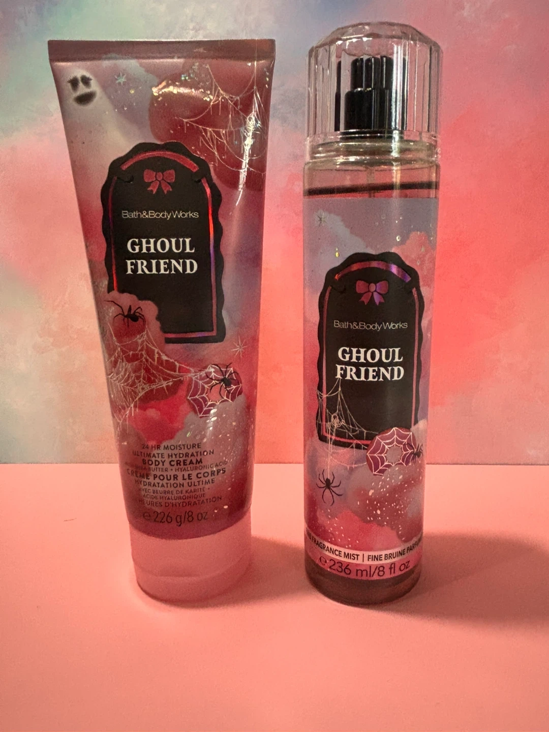 Selling a Bath & Body Works Ghoul Friend set! It includes a body cream (226 g/8 oz) and a fine fragrance mist (236 ml/8 fl oz). The body cream provides 24-hour moisture with shea butter and hyaluronic acid.