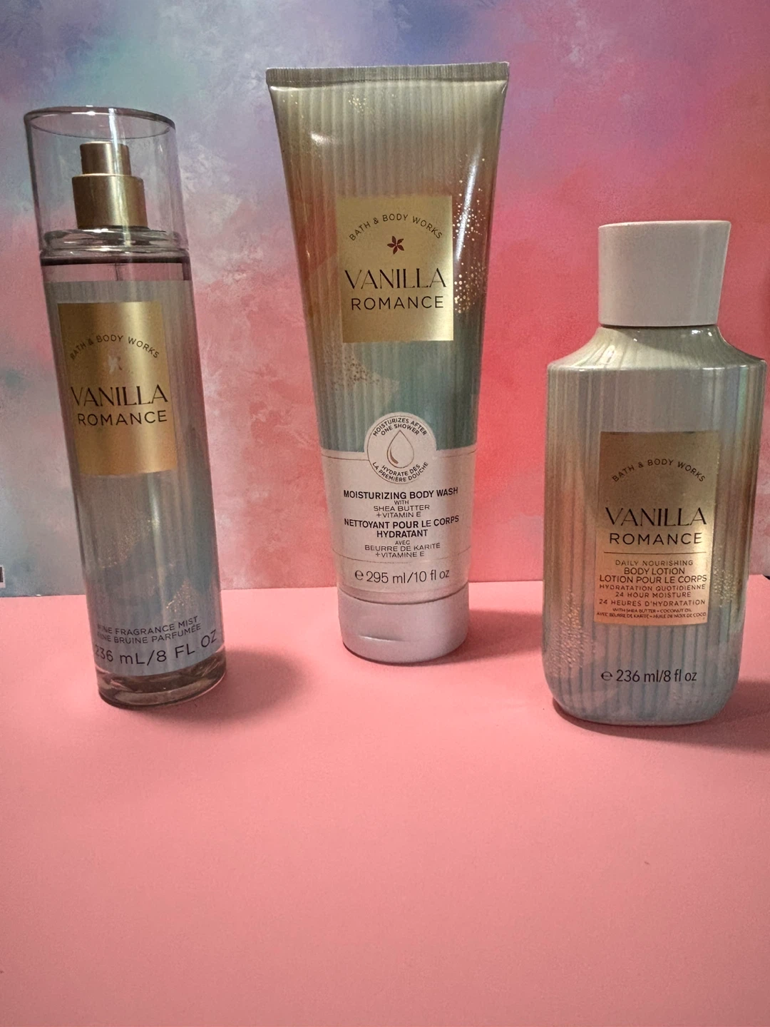 Selling a set of Bath & Body Works Vanilla Romance products! Includes a fine fragrance mist (236 ml/8 fl oz), a moisturizing body wash (295 ml/10 fl oz), and a daily nourishing body lotion (236 ml/8 fl oz)