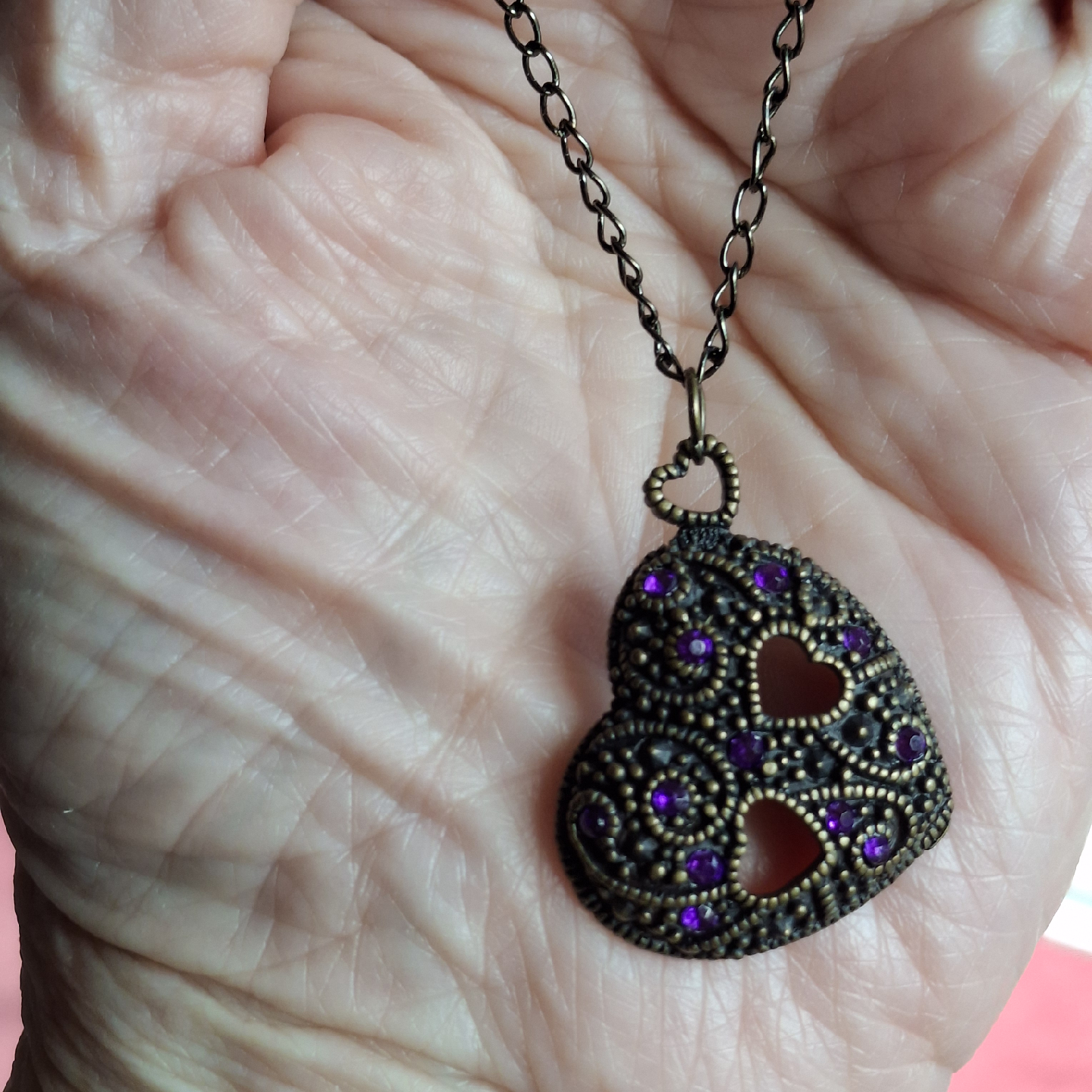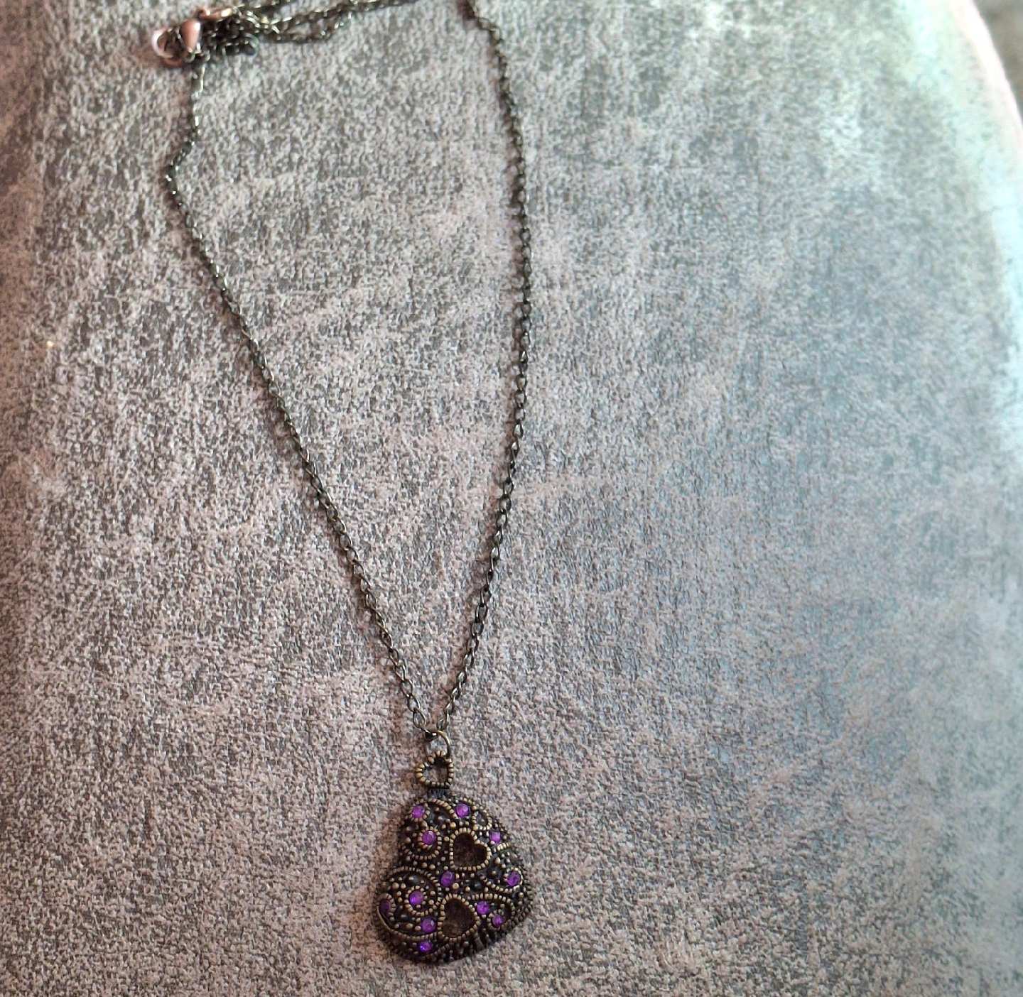 Cute heart pendant necklace with purple and bronze details! It would be a lovely addition to any outfit