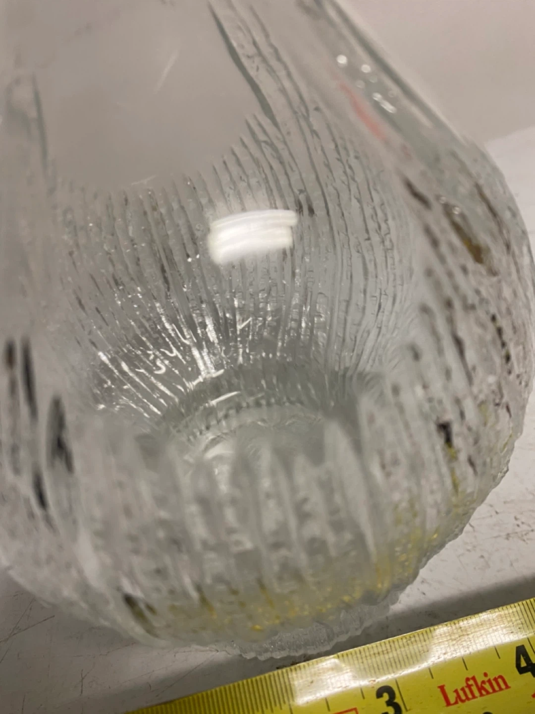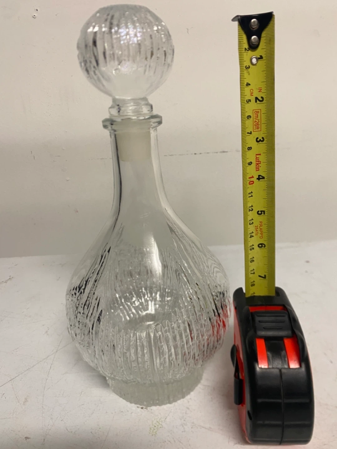 Selling a beautiful glass decanter, perfect for serving your favourite beverages! It comes with a matching glass stopper. The decanter has a textured design and a round stopper.