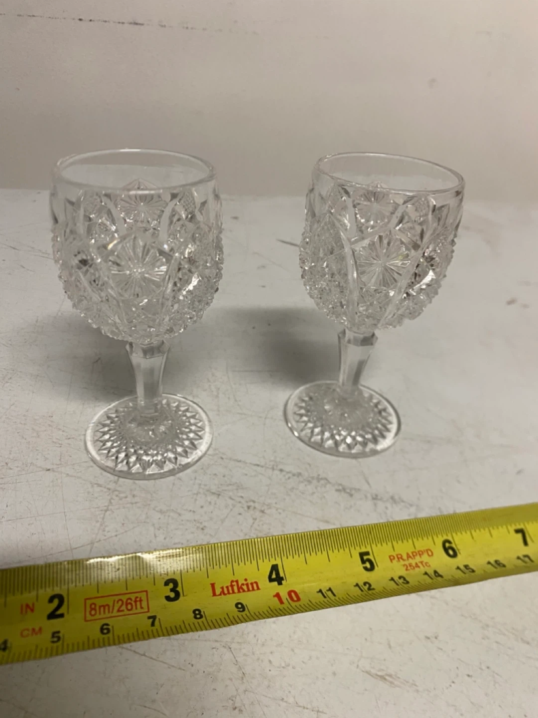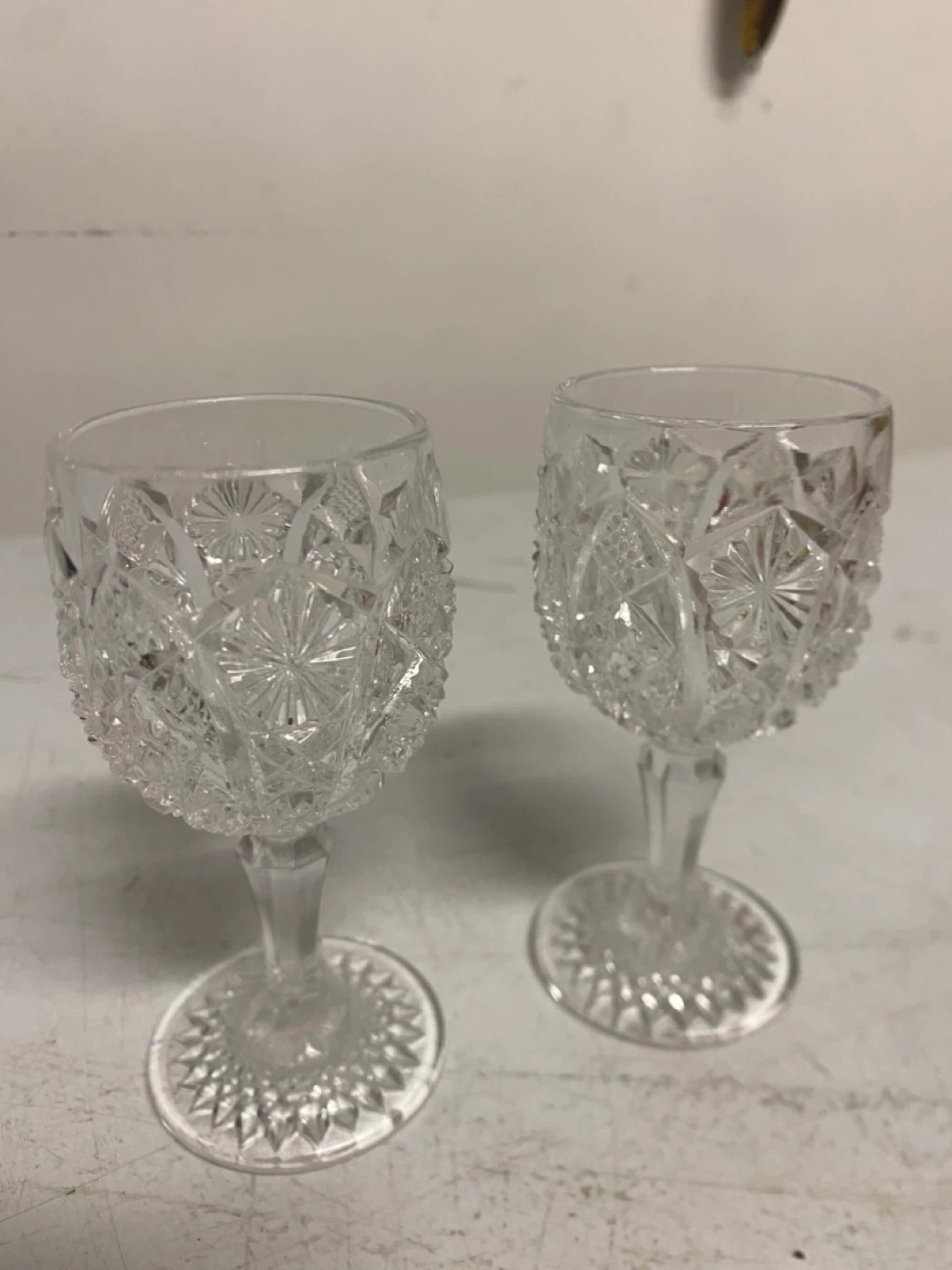 Selling a set of two vintage cut crystal cordial glasses. They have a beautiful, intricate design and would be a lovely addition to any home bar or collection. They are in great condition, with no chips or cracks!