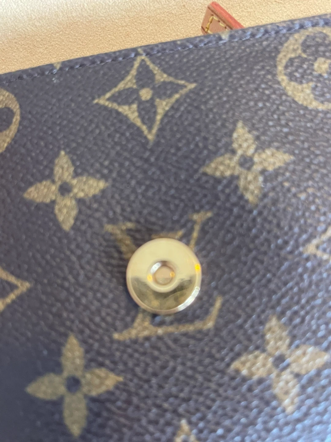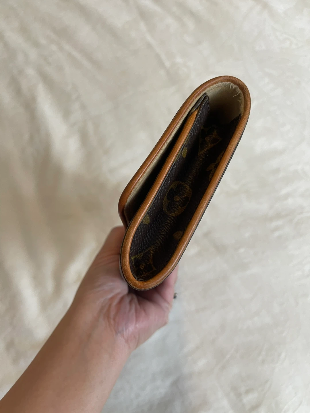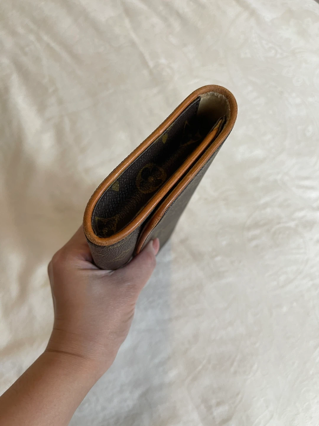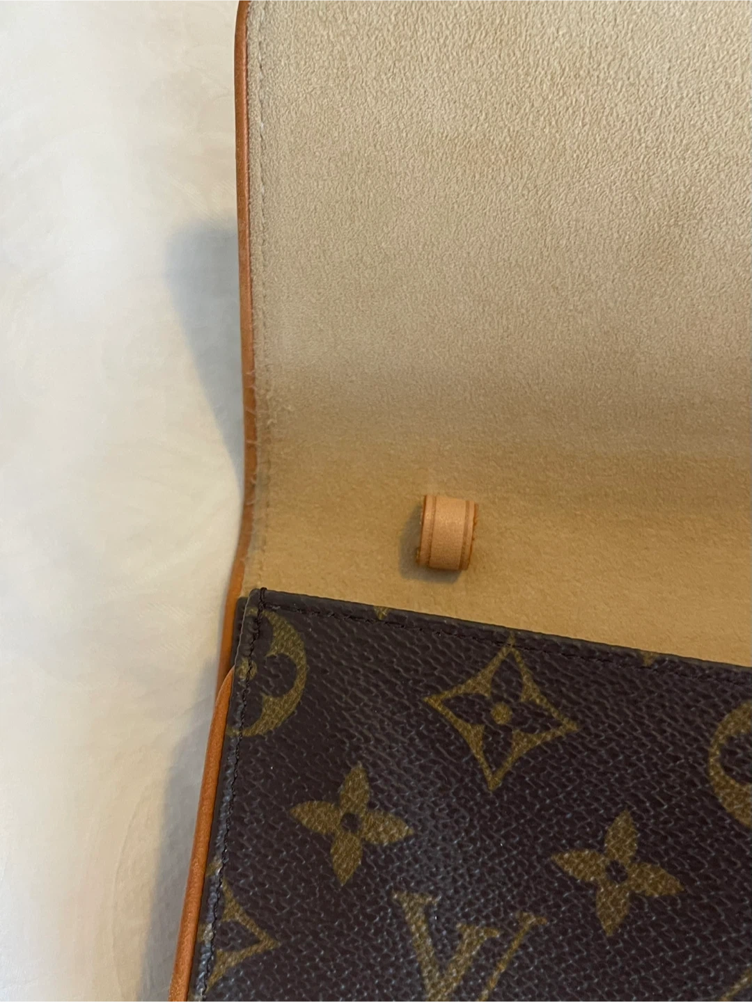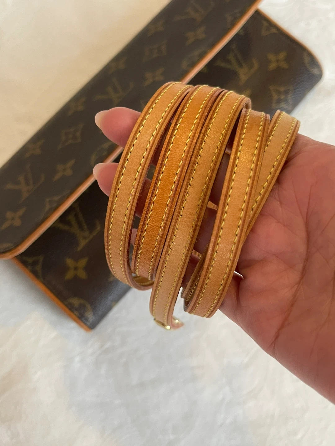—— The exterior canvas is clean and beautiful no cracks .The leather has developed a light dark patina throughout. The leather piping has some signs of wear in edges, The waistline/ crossbody strap has no creasing ,and no cracks still in good condition .The goldtone hardware it’s in great condition and still shiny .The interior is clean no foul smell / may notice some dirt but can be clean and overall it’s in excellent shape.