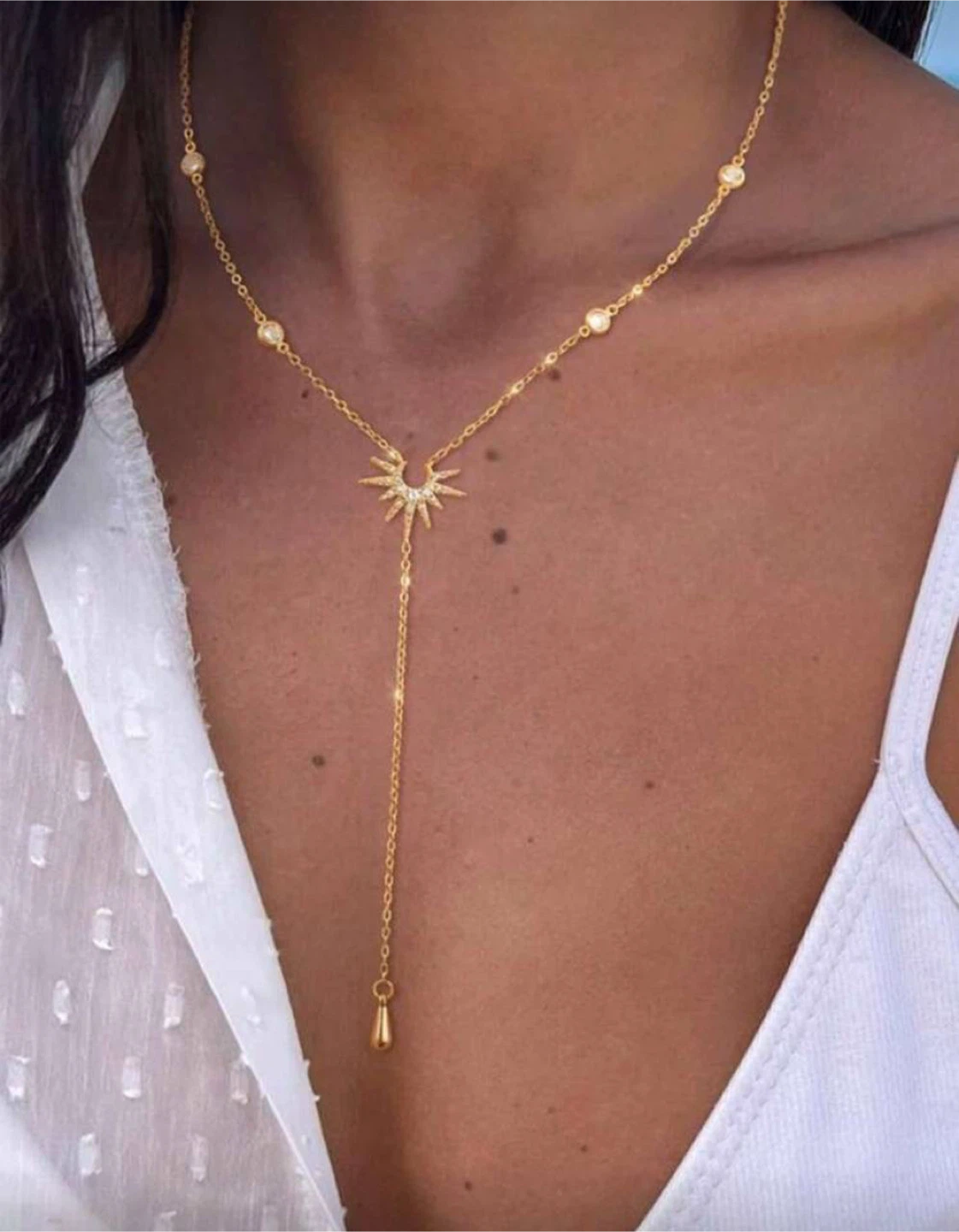✨ Sunburst charm at the center with drop chain design