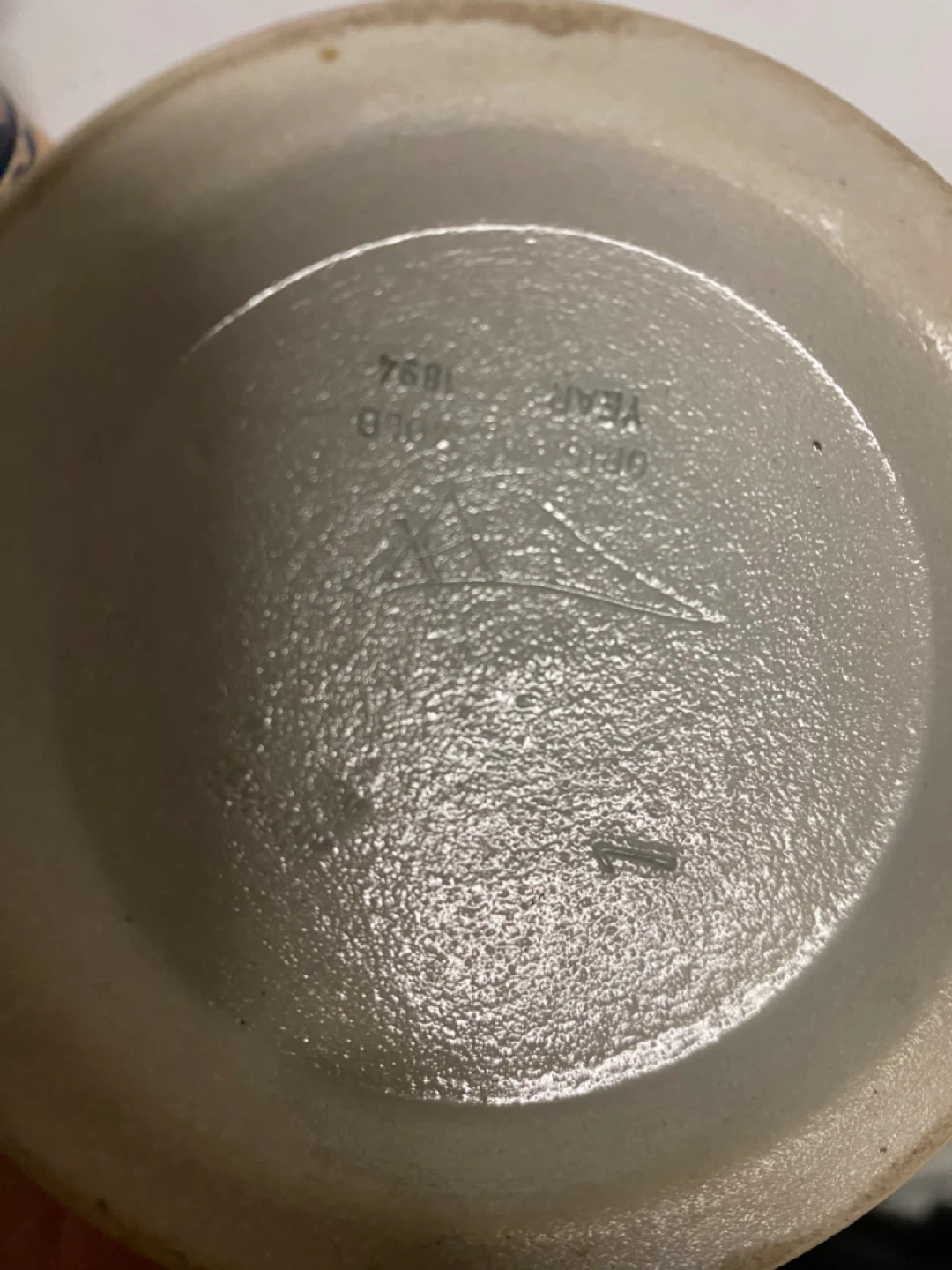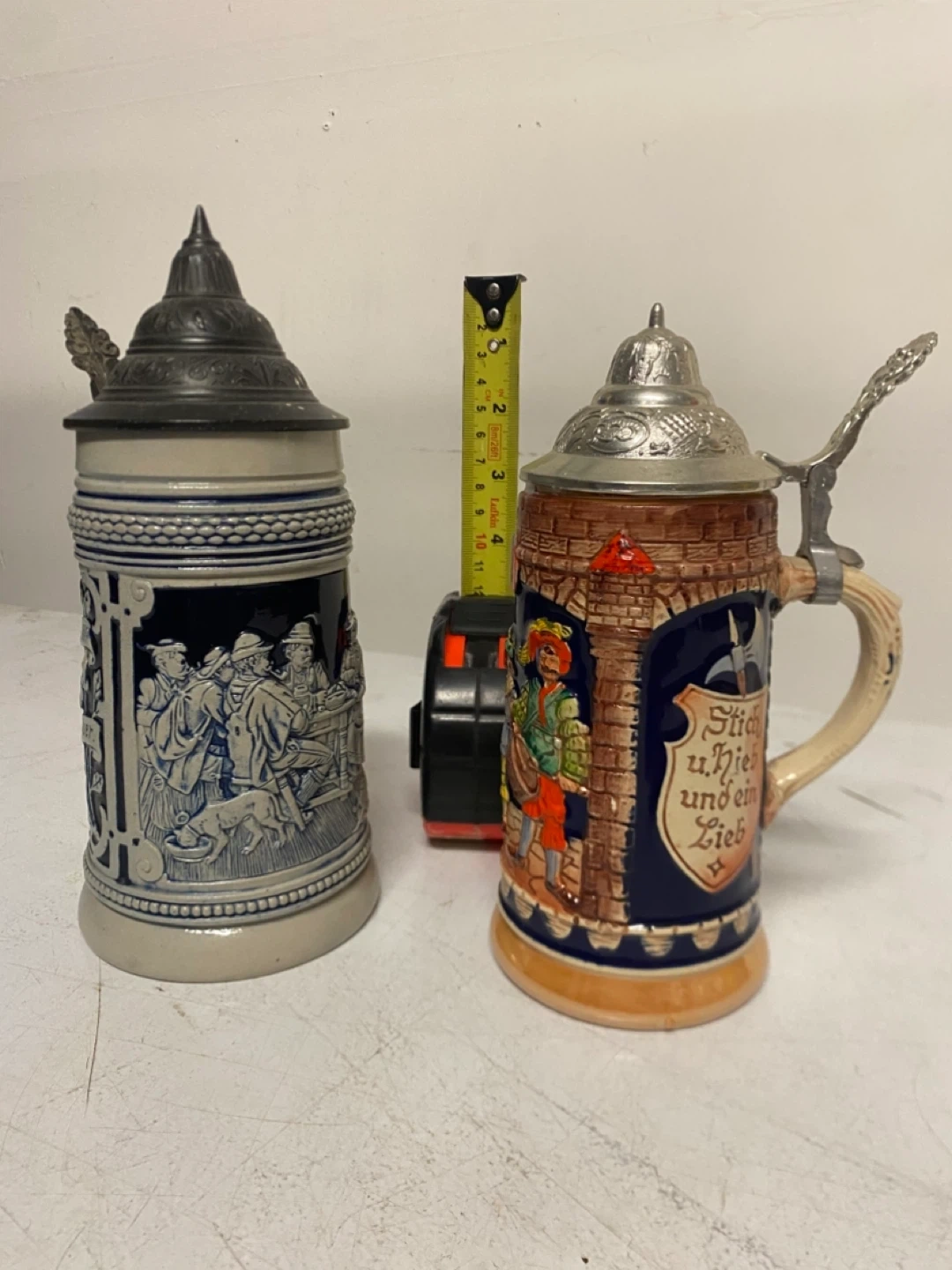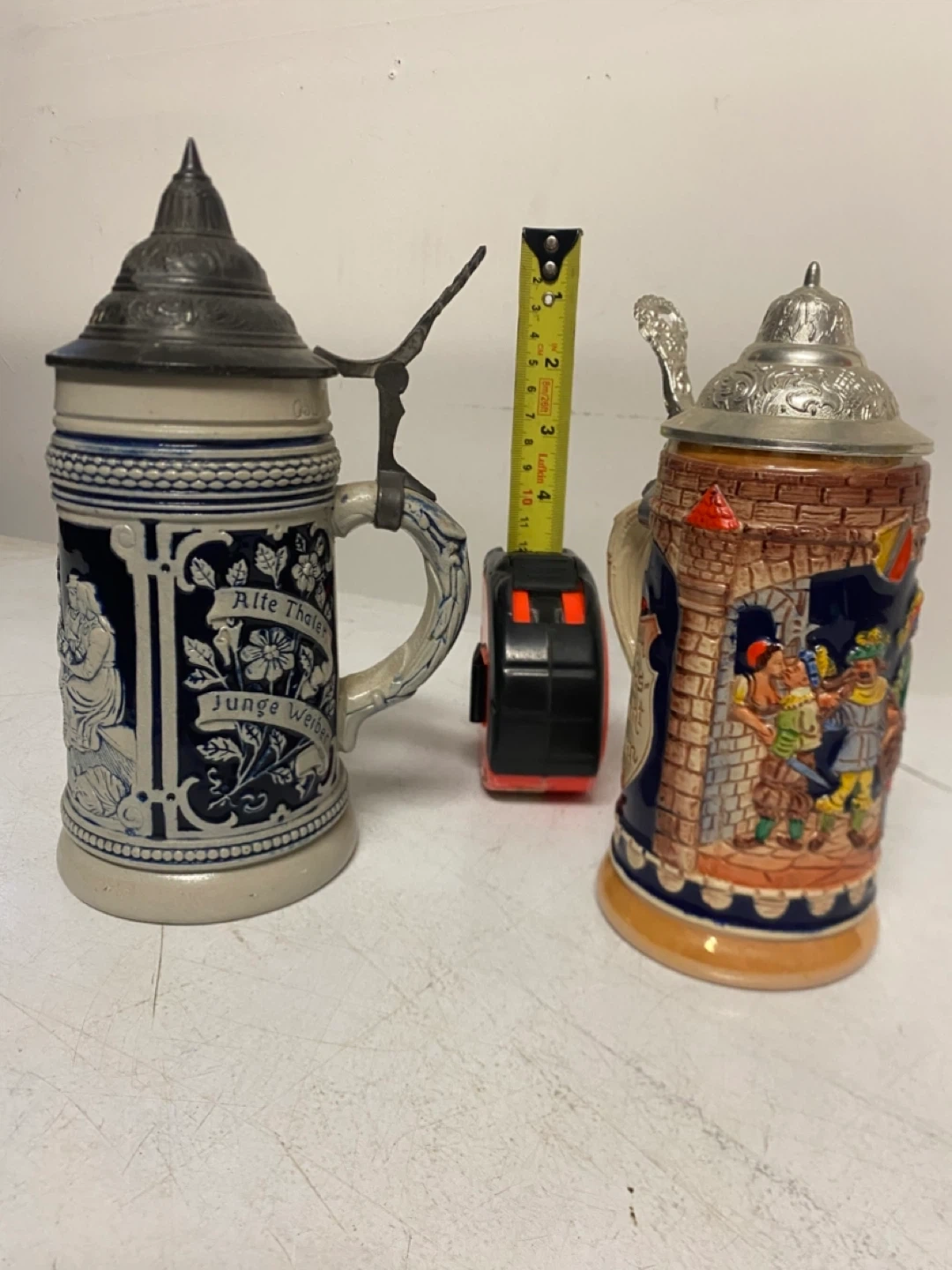 Selling a set of two vintage German beer steins. One stein features a blue and white design with the text "Alte Theater Junge Weiber". The other stein has a colourful scene with a building and figures. Both have hinged metal lids. The base of one stein is marked with "GERZ W. GERMANY". Great for collectors or as unique decor!