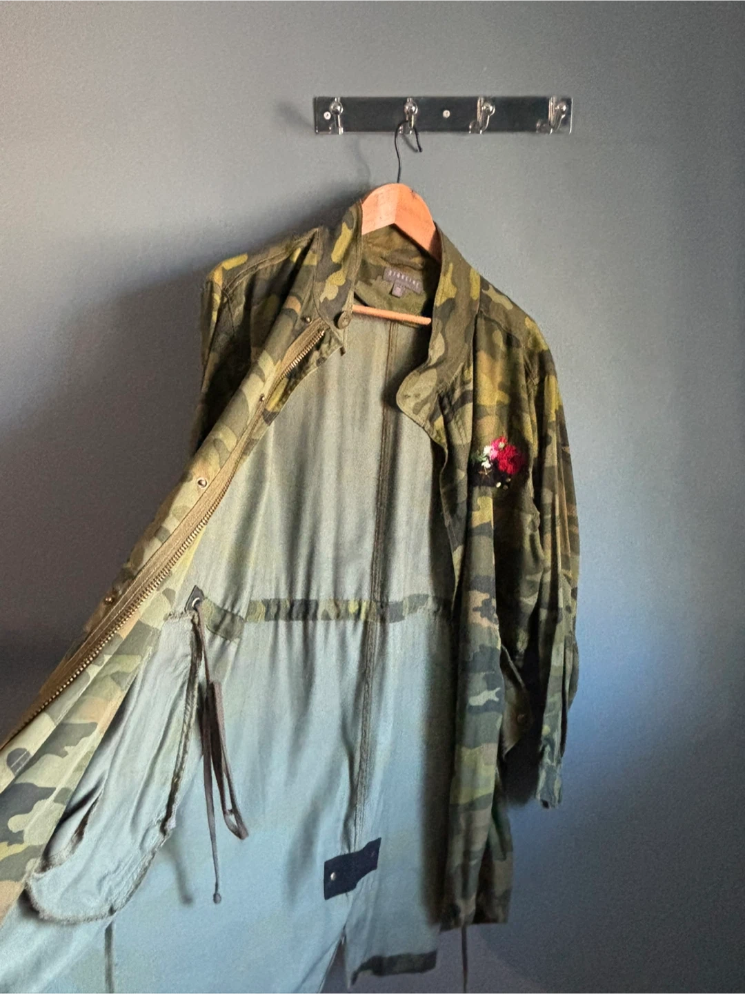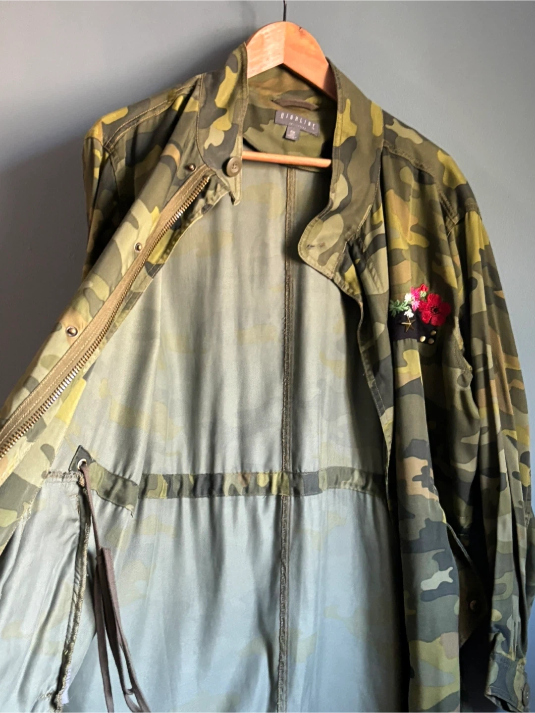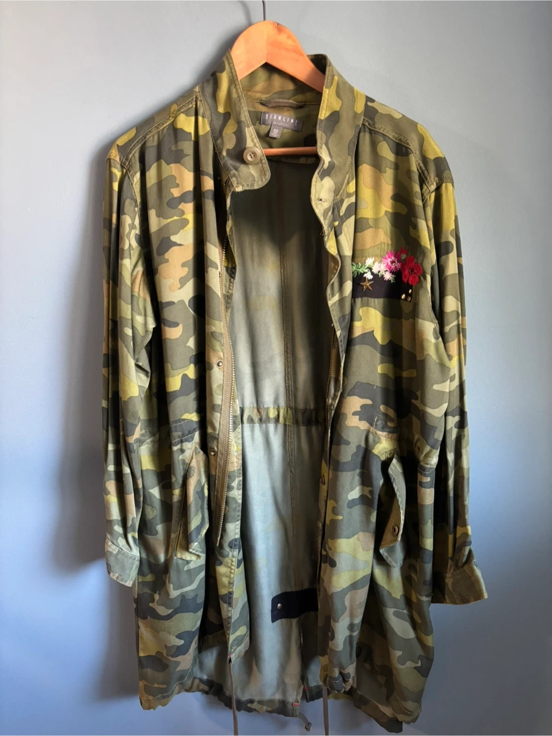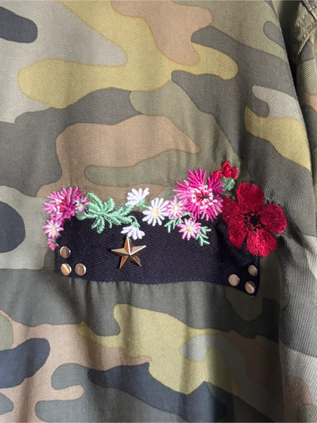 I'm selling a Highline Collective jacket in a cool camo print! It's a size medium and features some really nice floral embroidery on the front. Perfect for adding a bit of edge to your outfit!