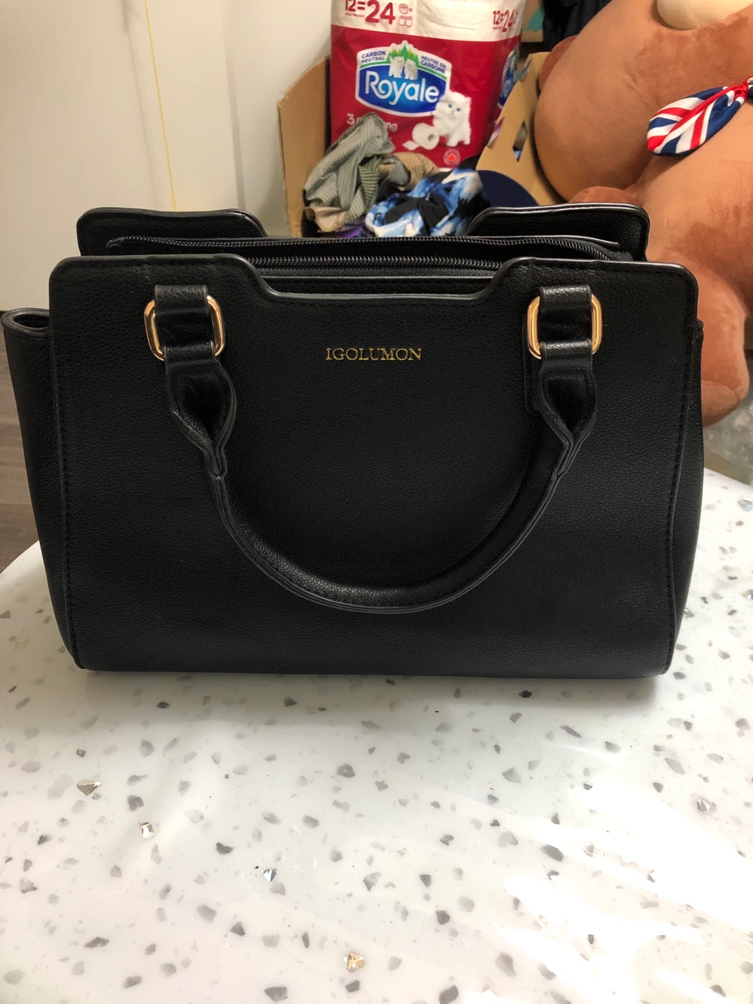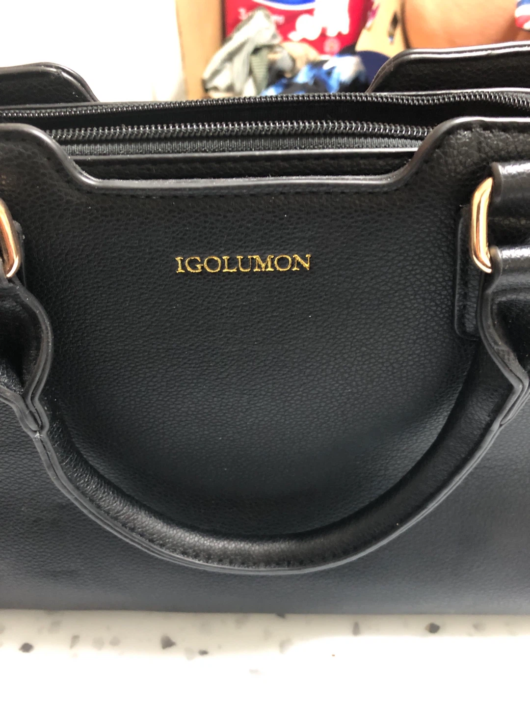 Selling a black handbag from IGOLUMON! It comes with a handy strap. The inside has a few pockets, great for keeping everything organized. Perfect for everyday use