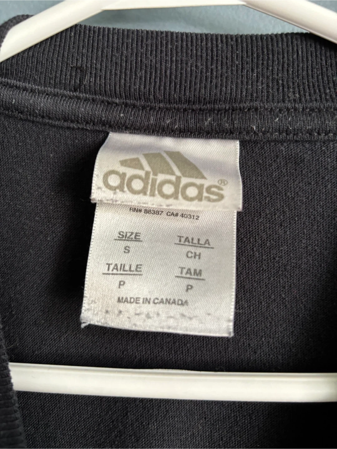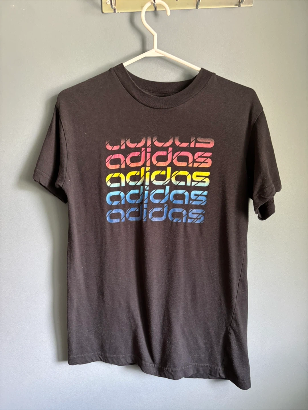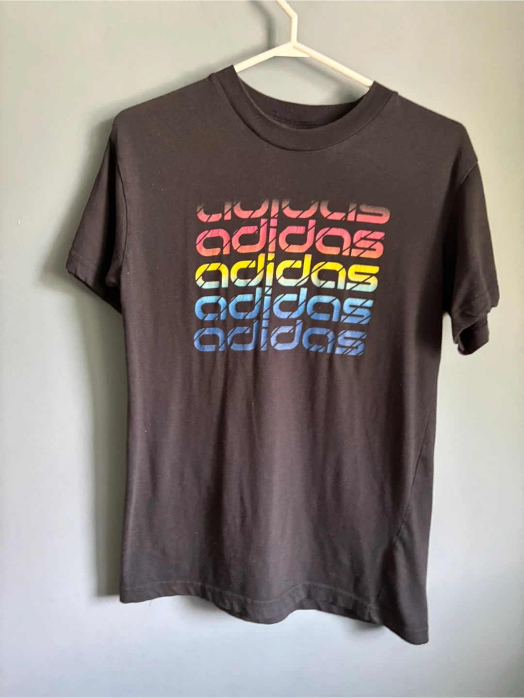 Selling a black Adidas t-shirt in size small. It features the Adidas logo in a cool, colourful stacked design on the front. Great for casual wear or sports!