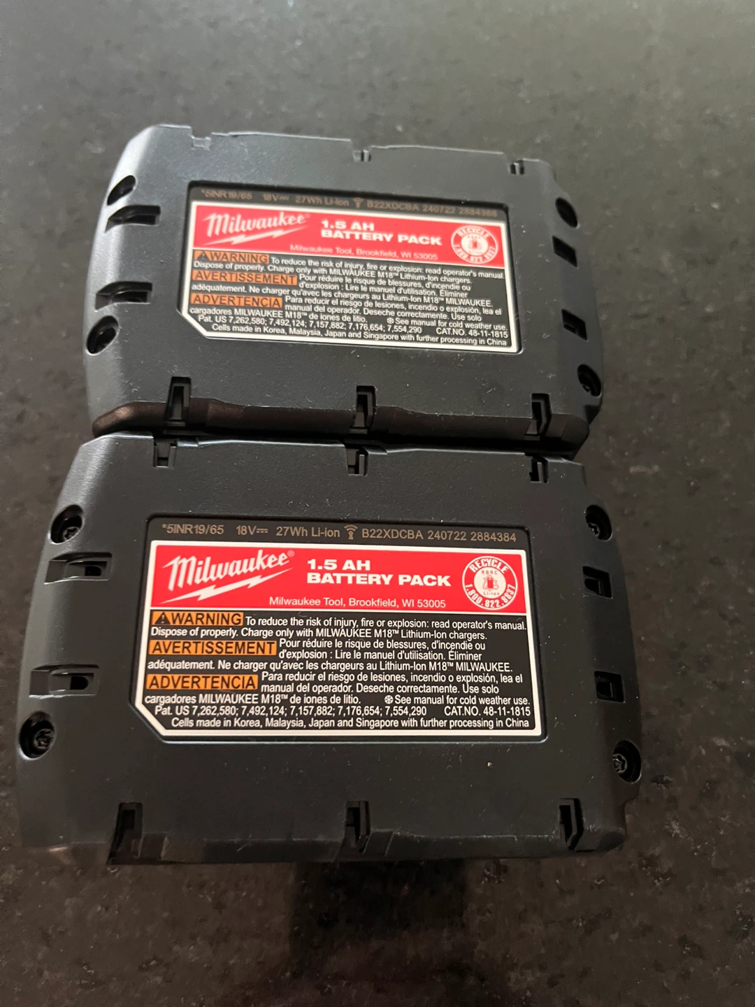 Selling a pair of Milwaukee M18 RedLithium CP1.5 18V 1.5 Ah battery packs. They're in almost new shape and ready to power your tools!
