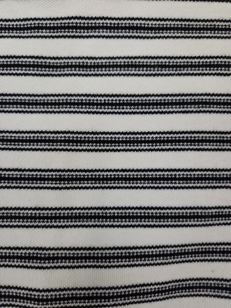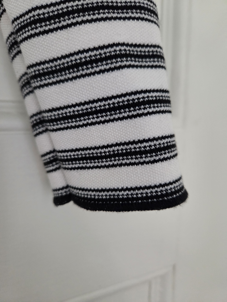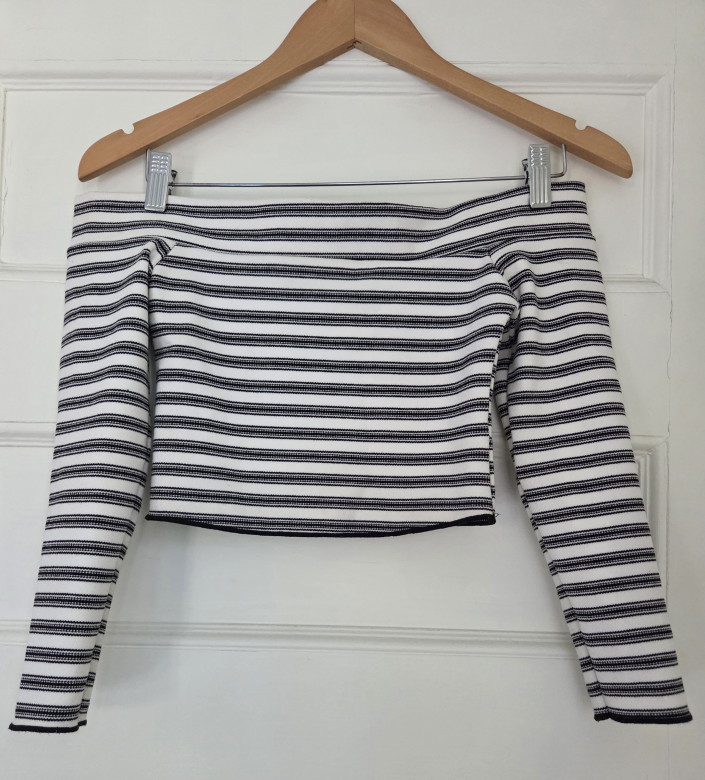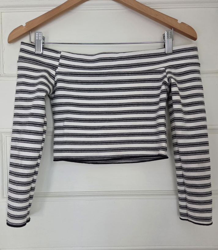 Black and white stripes print, off the shoulder top, long sleeves and sweater fabric. Nice, thick knit material. Smoke free and pet free home.