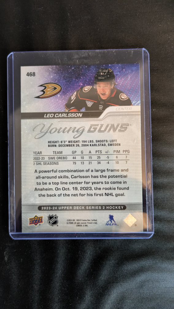 Selling a Leo Carlsson Upper Deck Young Guns hockey card. The card is from the 2023-24 Upper Deck Series 2 Hockey set. Carlsson is listed as a Center, born December 26, 2004, and shoots left. He's 6'3" and weighs 194 lbs. A powerful combination of a large frame and all-around skills, Carlsson has the potential to be a top line center for years to come in Anaheim. On Oct 19, 2023, the rookie found the back of the net for his first NHL goal