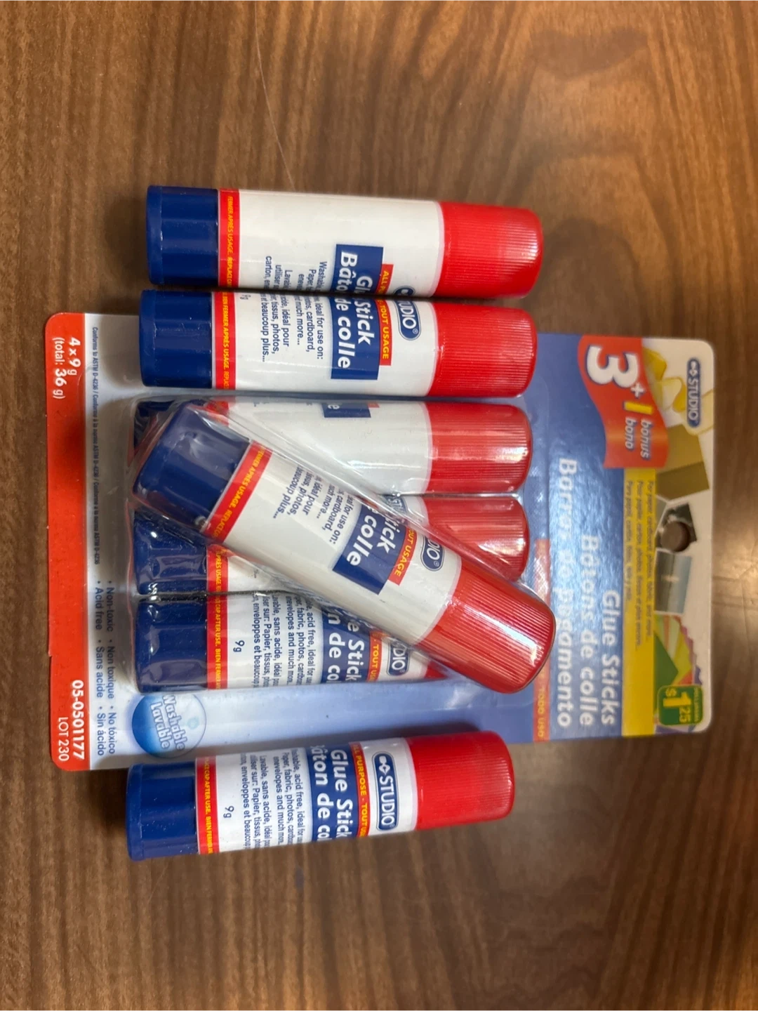Studio brand glue sticks, perfect for all your paper, fabric, and cardboard projects! This pack includes 4 sticks, each containing 9g of glue. They're washable and acid-free, so they're safe for all kinds of uses