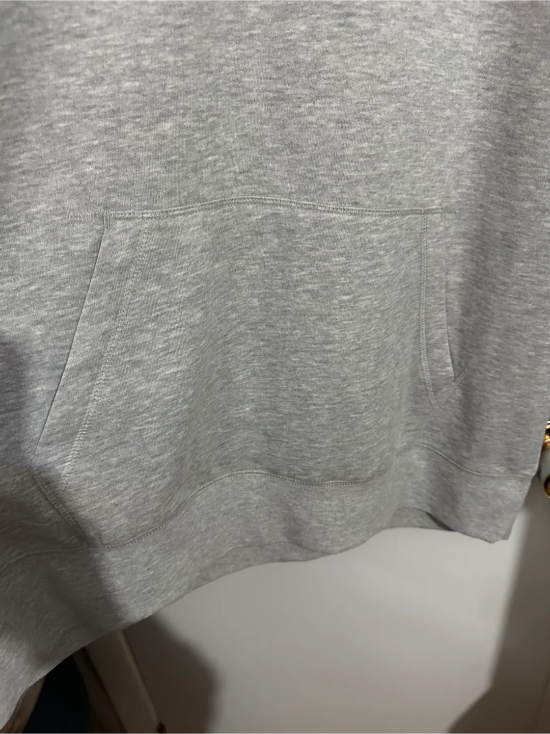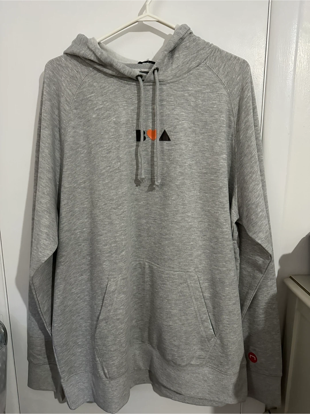 Selling an Athletic hoodie in heather grey. It has a unique design with a black square, orange heart, and black triangle on it. It's in great condition and super comfy! Brand new never worn, smoke free home.