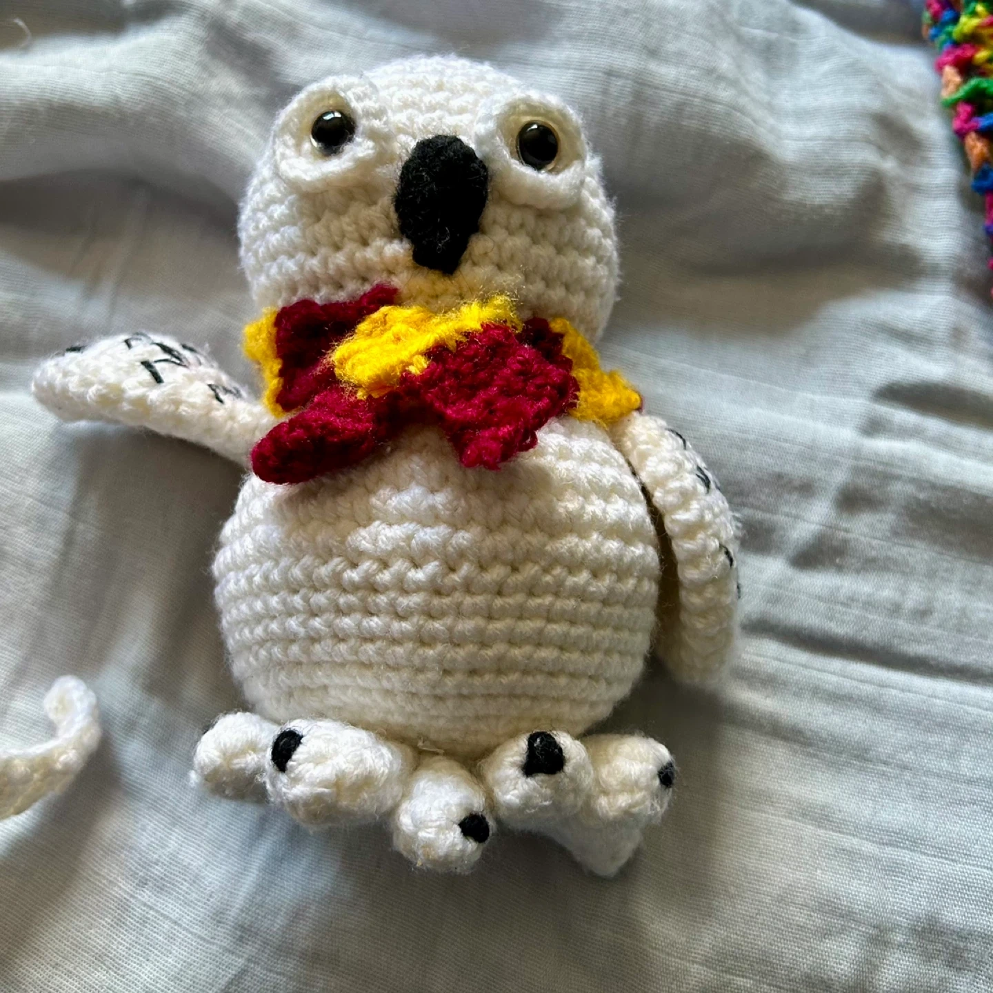A cute, handmade crocheted owl plushie! It's white with a Gryffindor-themed scarf (red and yellow). A perfect little friend for any Harry Potter fan!