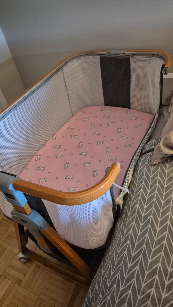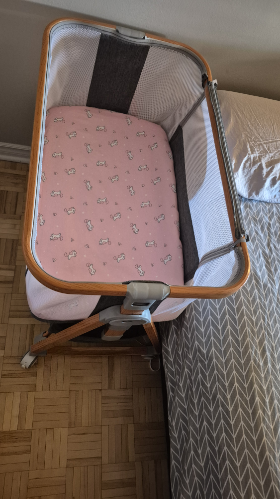 Selling a baby beside bassinet that's in like-new condition! It features a sturdy wooden frame and breathable mesh sides for your little one's comfort and safety. The bassinet also has wheels, making it easy to move from room to room. It's easy to disassemble for traveling.