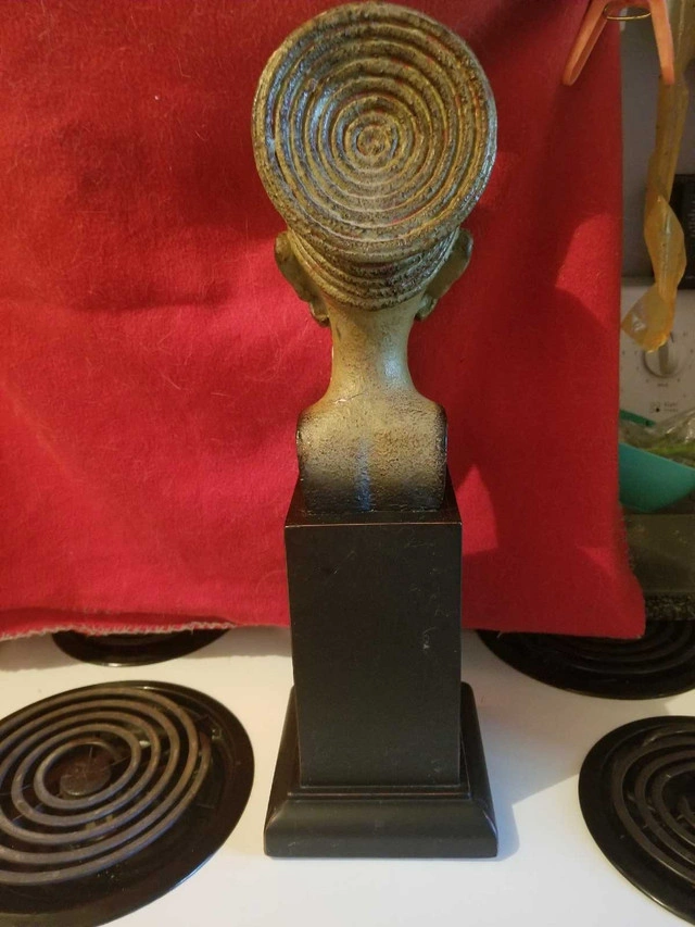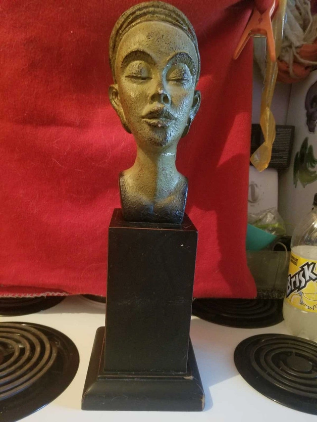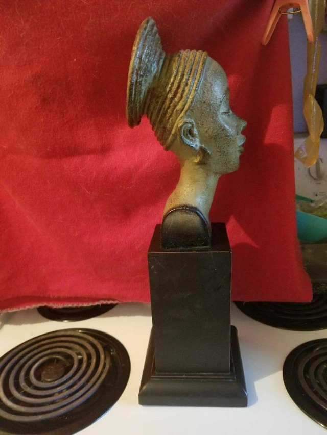 This head bust is a unique art piece, perfect for adding an exotic touch to any room. This is a used item, but remains in good condition. It stands approximately 12 inches (30 cm) tall. Its unique look is sure to add character to your home or office. I'm asking $50. If the ad is still up, then yes, it is still available!