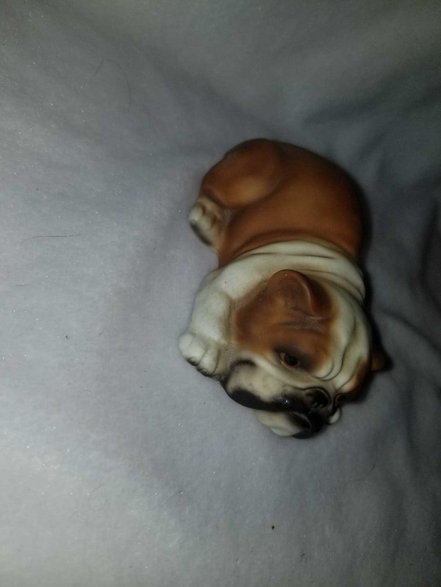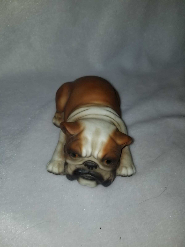 This charming, used bulldog figurine captures the breed's iconic, endearing expression and sturdy build. The bulldog is lying down, features a glossy finish, and showcases detailed facial features. It is in good condition. It's the sort of item that adds a bit of character to any room. I've enjoyed having it, but it's time for it to find a new home. If the ad is up, yes, it is still available!