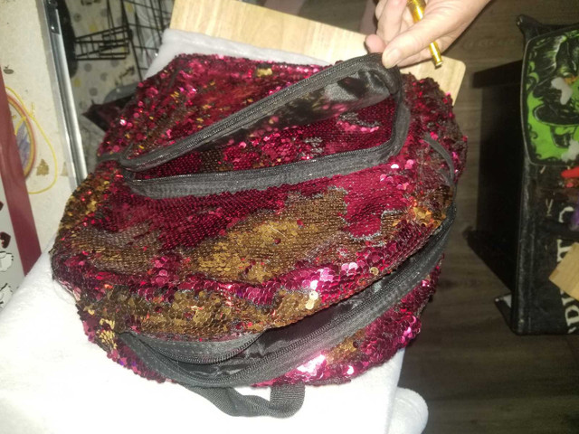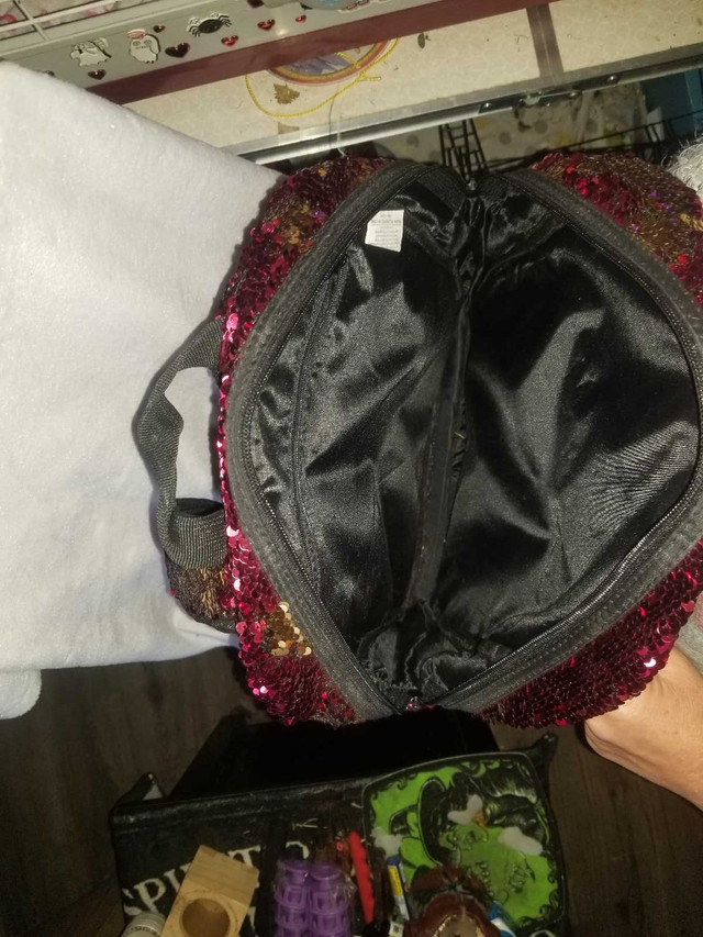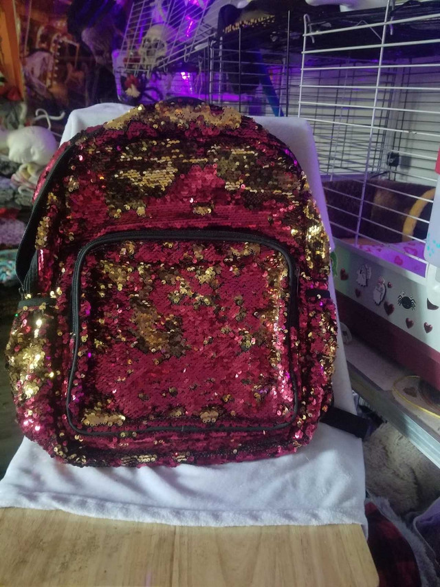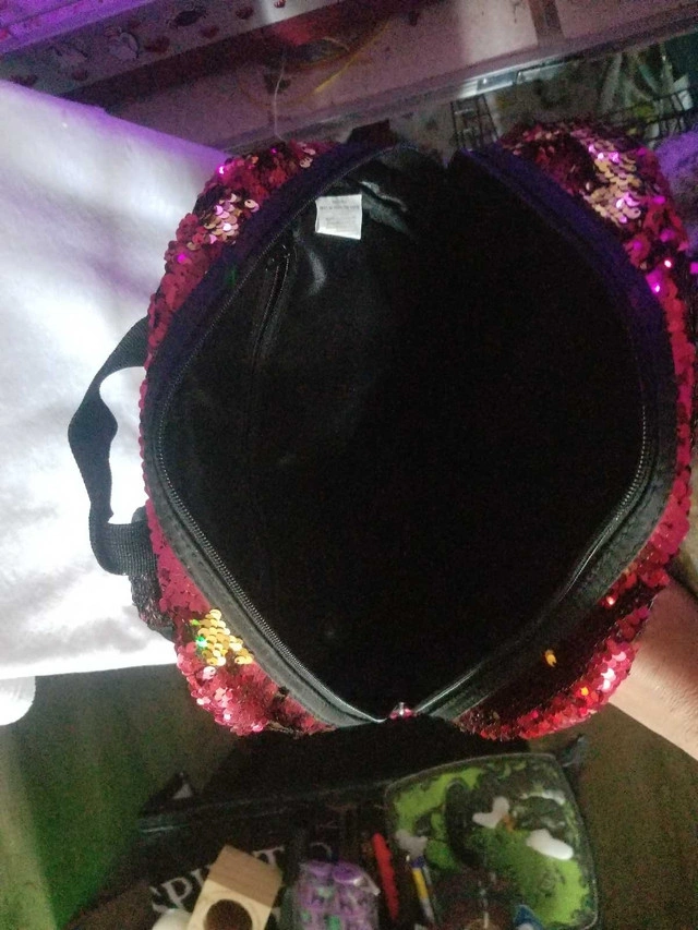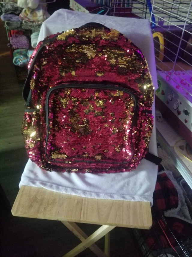 Add some sparkle to your life with this sequin backpack! This eye-catching backpack features reversible sequins that shimmer in the light, making it a fun and stylish accessory. It's in used condition. Perfect for school, travel, or just adding a touch of glamour to your everyday look. Features: * Spacious main compartment * Front pocket for smaller items * Adjustable shoulder If the ad is up, it's available!