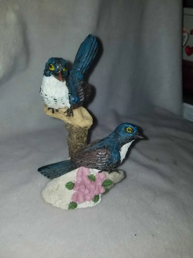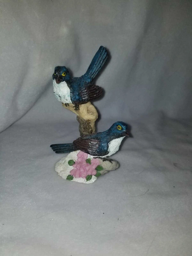 This delightful bird figurine features two charming bluebirds perched on a branch with delicate pink flowers. It's a lovely decorative piece that will add a touch of nature to any room. It has been previously owned and is in good condition, ready to find a new home where it can be admired. If the ad is up, the birds are ready to fly to their new nest! Available now!