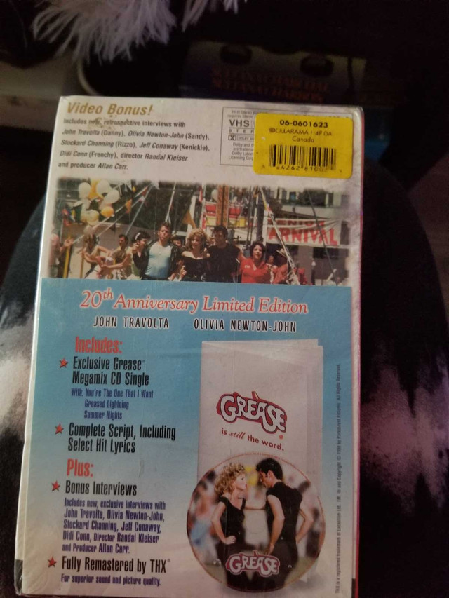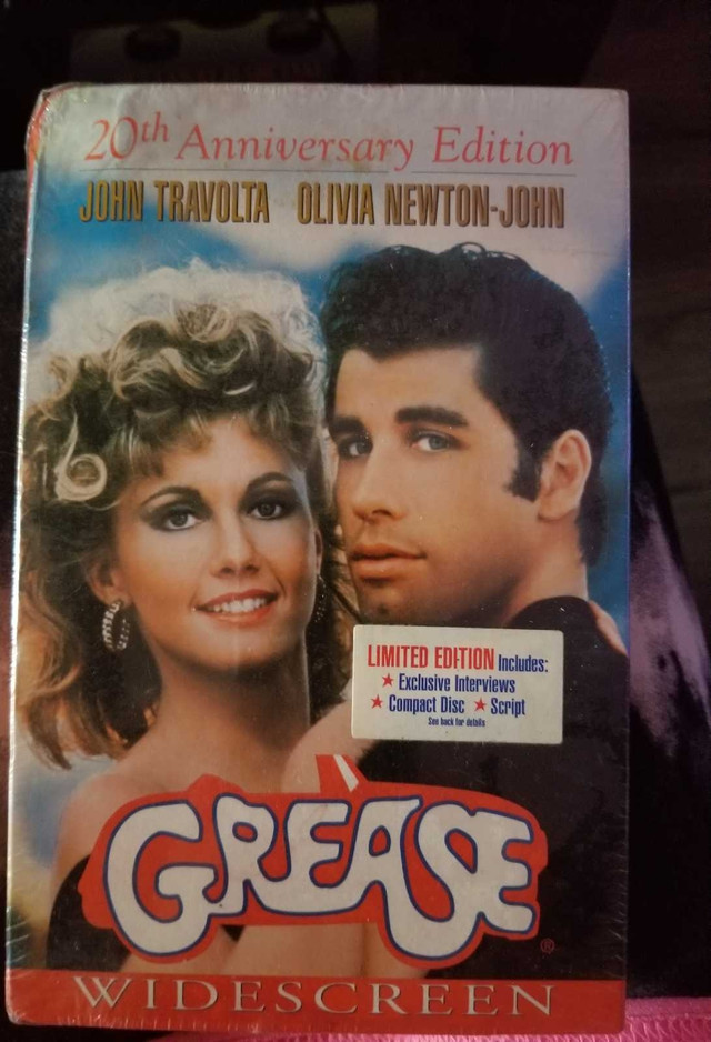 Relive the magic of Rydell High with this 20th Anniversary Limited Edition widescreen VHS of Grease, starring John Travolta and Olivia Newton-John! This vintage tape is in good condition and includes exclusive bonus features like interviews, a megamix CD single, and the complete script. A must-have for any Grease fan or collector of classic movies! Own a piece of cinematic history and get ready to sing along to all your favourite tunes. This could be a fun movie night for slumber parties, retro-themed gatherings, or anyone who appreciates a good old-fashioned sing-along. But don't wait too long, or you might miss your chance to dance and groove with Danny and Sandy! If the ad's up, it's available!