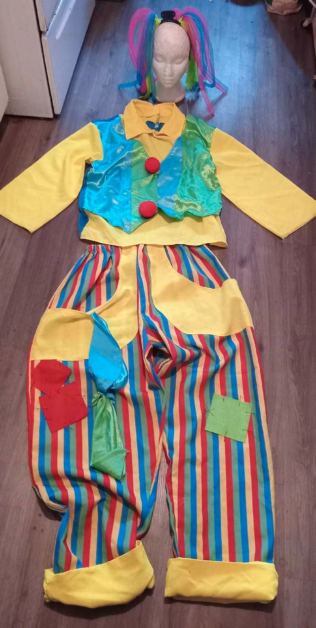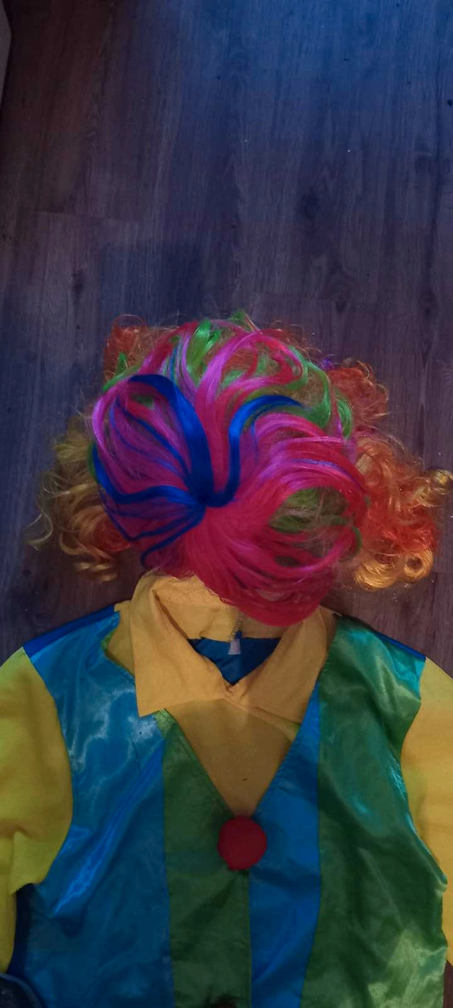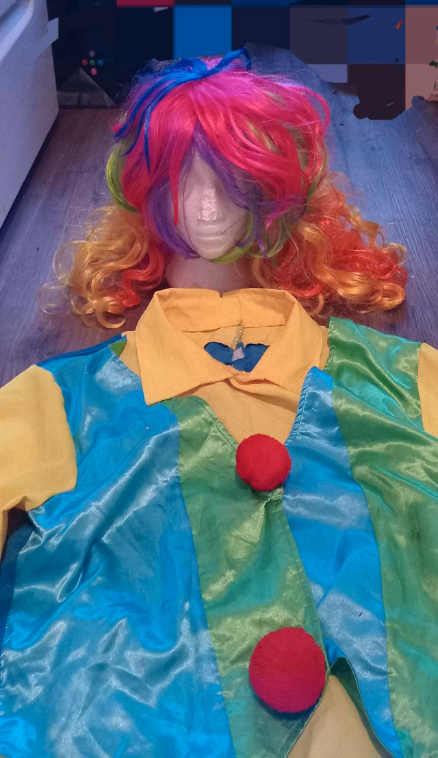 Get ready to clown around with this vibrant and playful used clown costume! This eye-catching ensemble features a colourful top, striped pants, and a fun wig, perfect for parties, Halloween, or just bringing smiles. Although this costume has been pre-loved, it's still ready for a new adventure! If the ad is up, it's available.