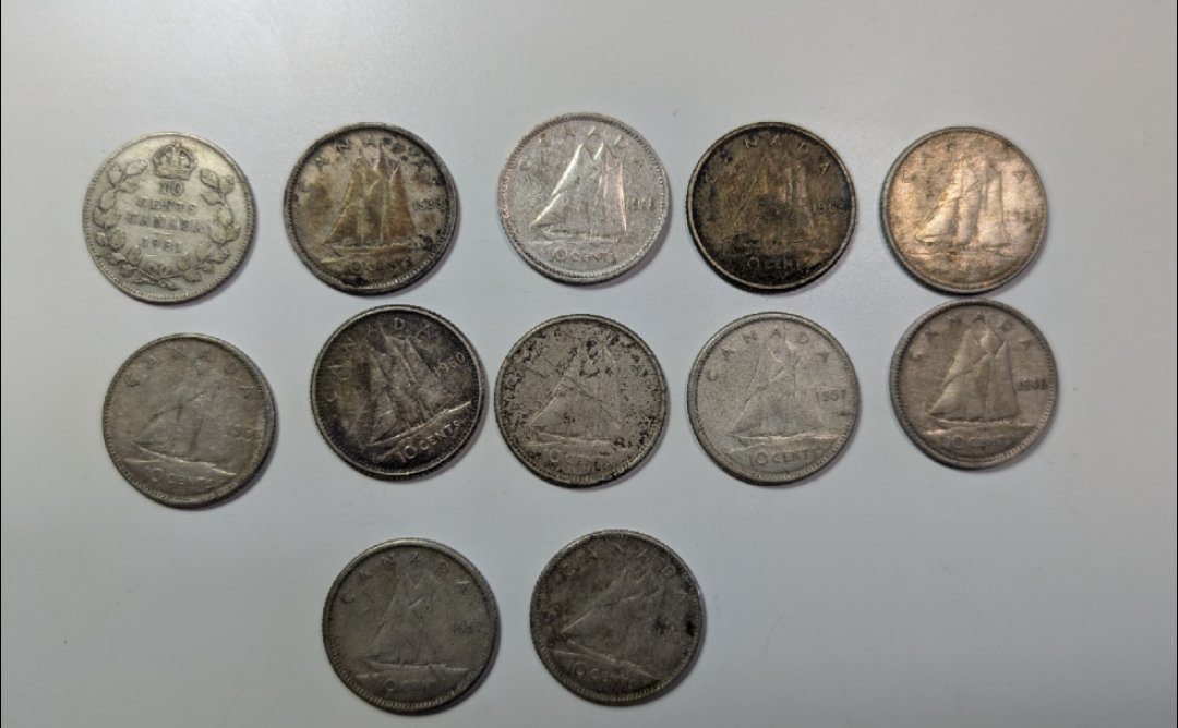 Selling a collection of vintage Canadian silver dimes. These coins feature various designs and years, making them a unique addition to any collection. They show signs of wear consistent with their age, adding to their historical charm. Perfect for collectors or anyone interested in Canadian history