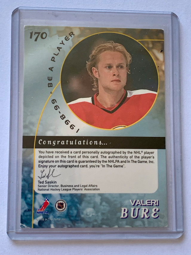I'm offering a selection of Valeri Bure NHL hockey cards, including an autographed card and several rookie cards. These cards are from the late 90s and early 2000s and are perfect for any hockey card collector.