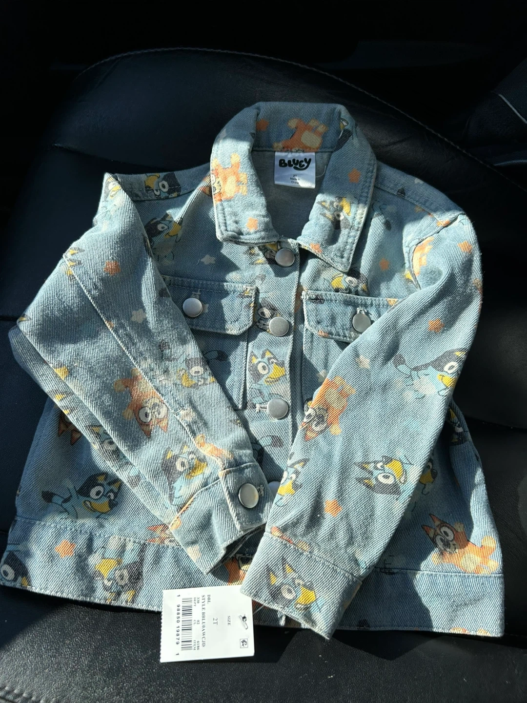 Super cute Bluey denim jacket in size 2T! It's in great condition and features an all-over Bluey character print. Perfect for any little Bluey fan! Price is firm. Will not lower Giftable condition with the tags