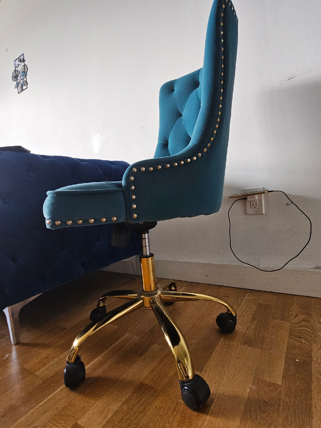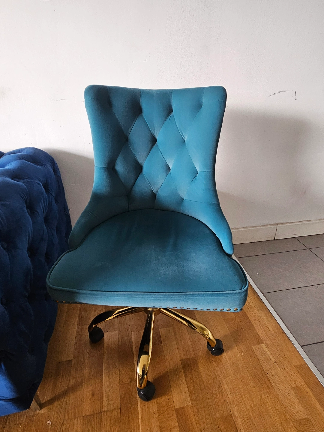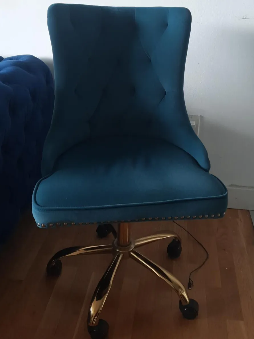 Selling a stylish teal velvet office chair! It features a comfortable tufted back and a shiny gold base with wheels. Perfect for adding a pop of colour and elegance to your workspace