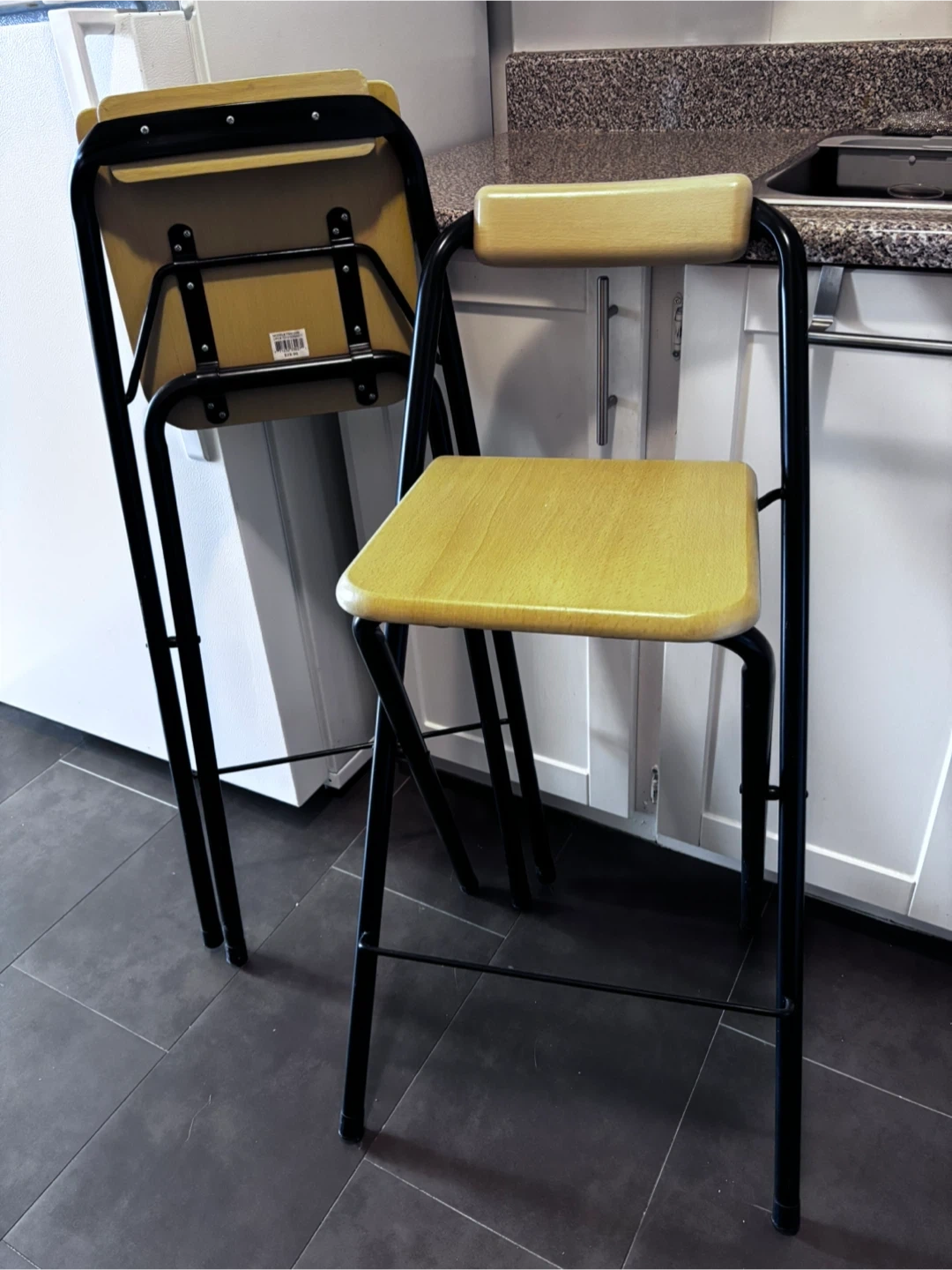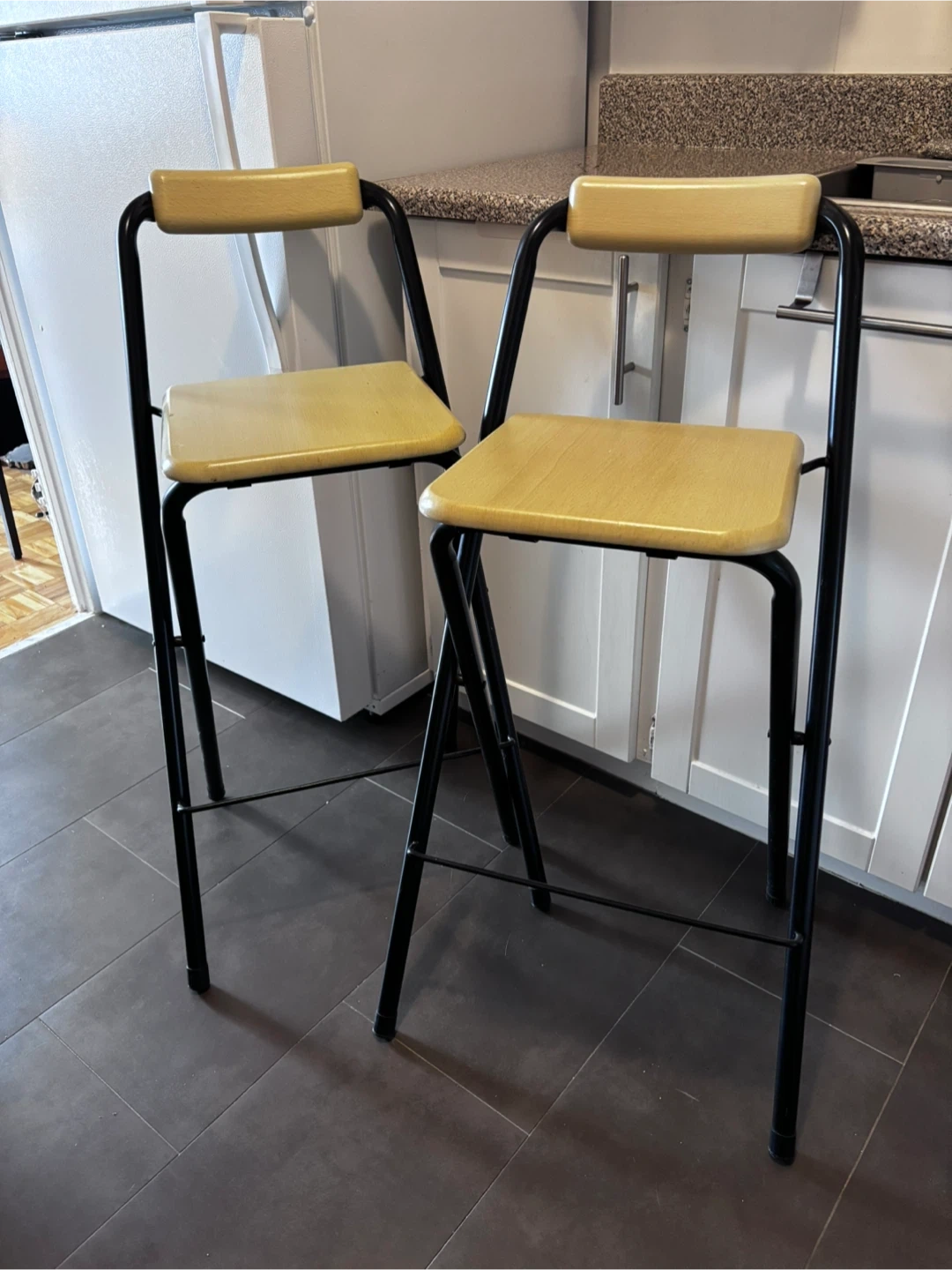 Selling a couple of IKEA Franklin bar stools. They're the folding type, so they're easy to store. Great for adding extra seating in a small space!