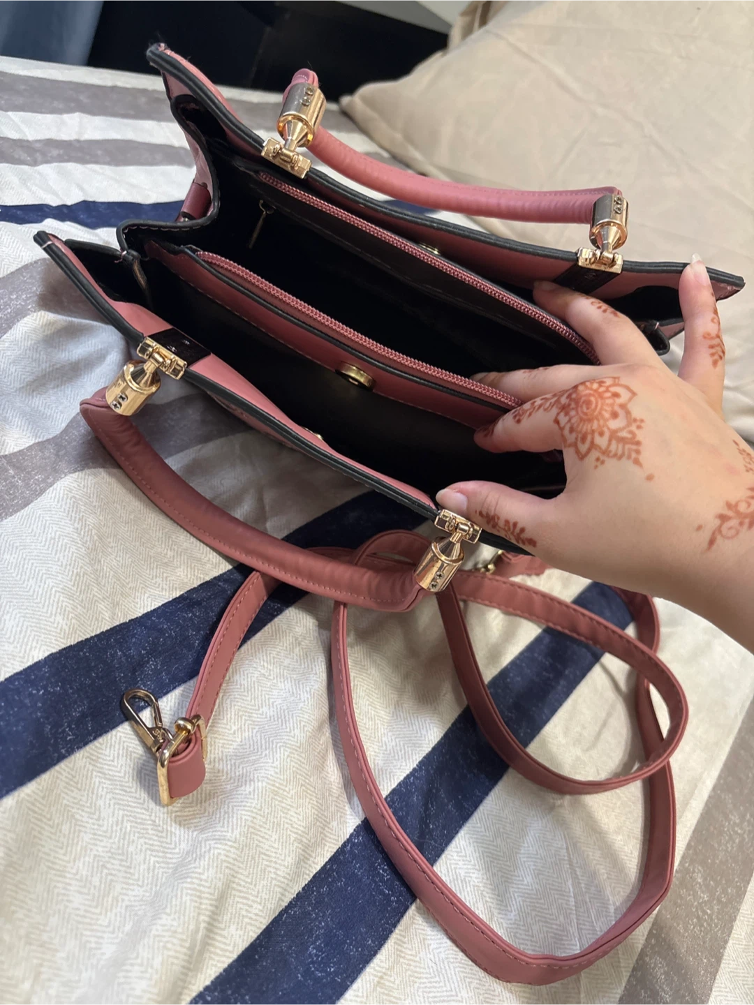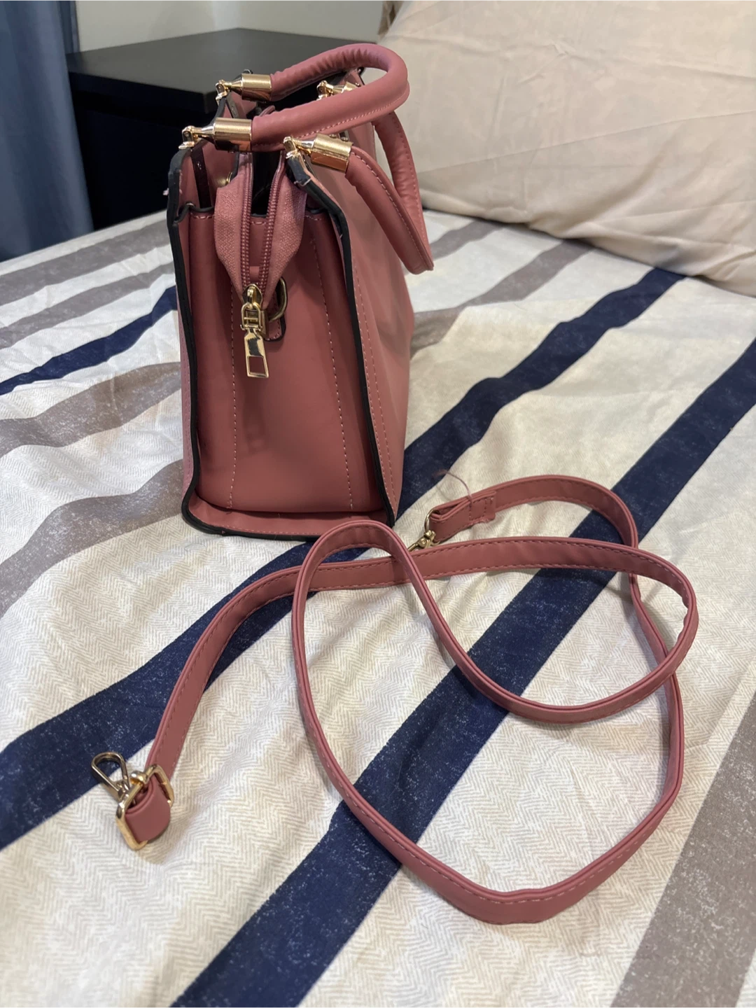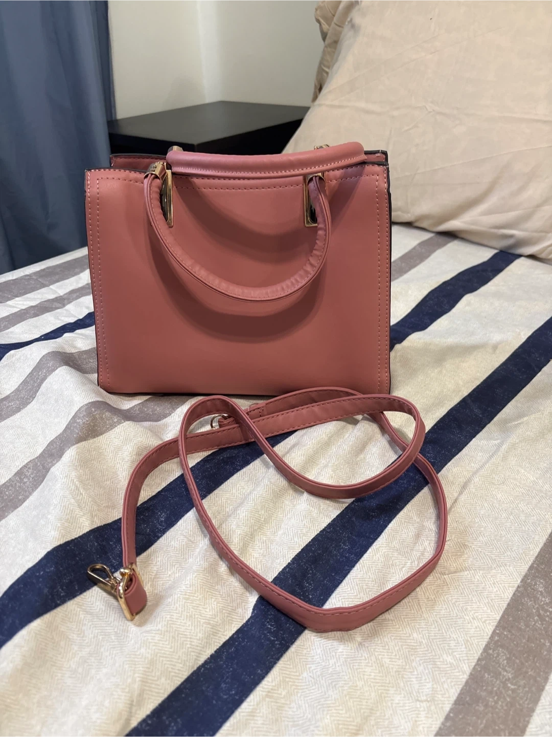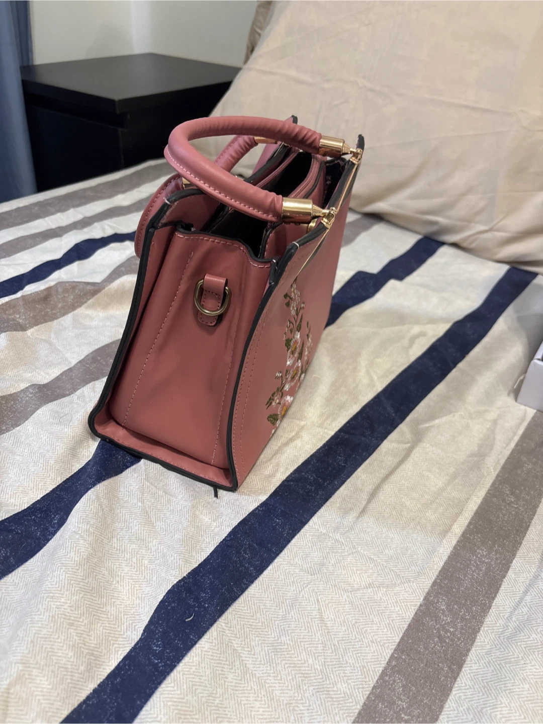 Selling a cute pink handbag with floral embroidery. It features a top handle and a detachable shoulder strap. The bag has a structured shape and gold-tone hardware details. It's in great condition and perfect for everyday use!