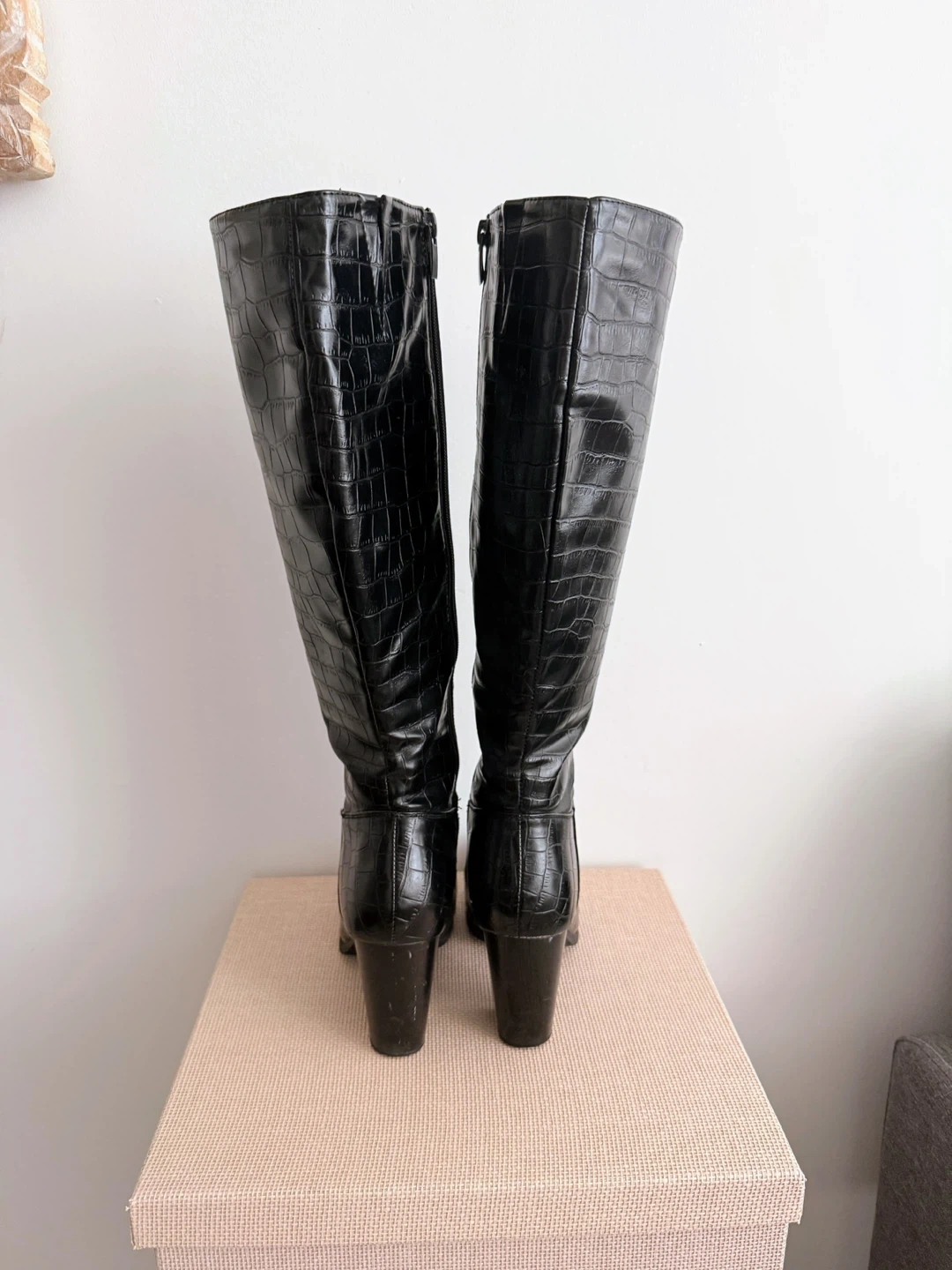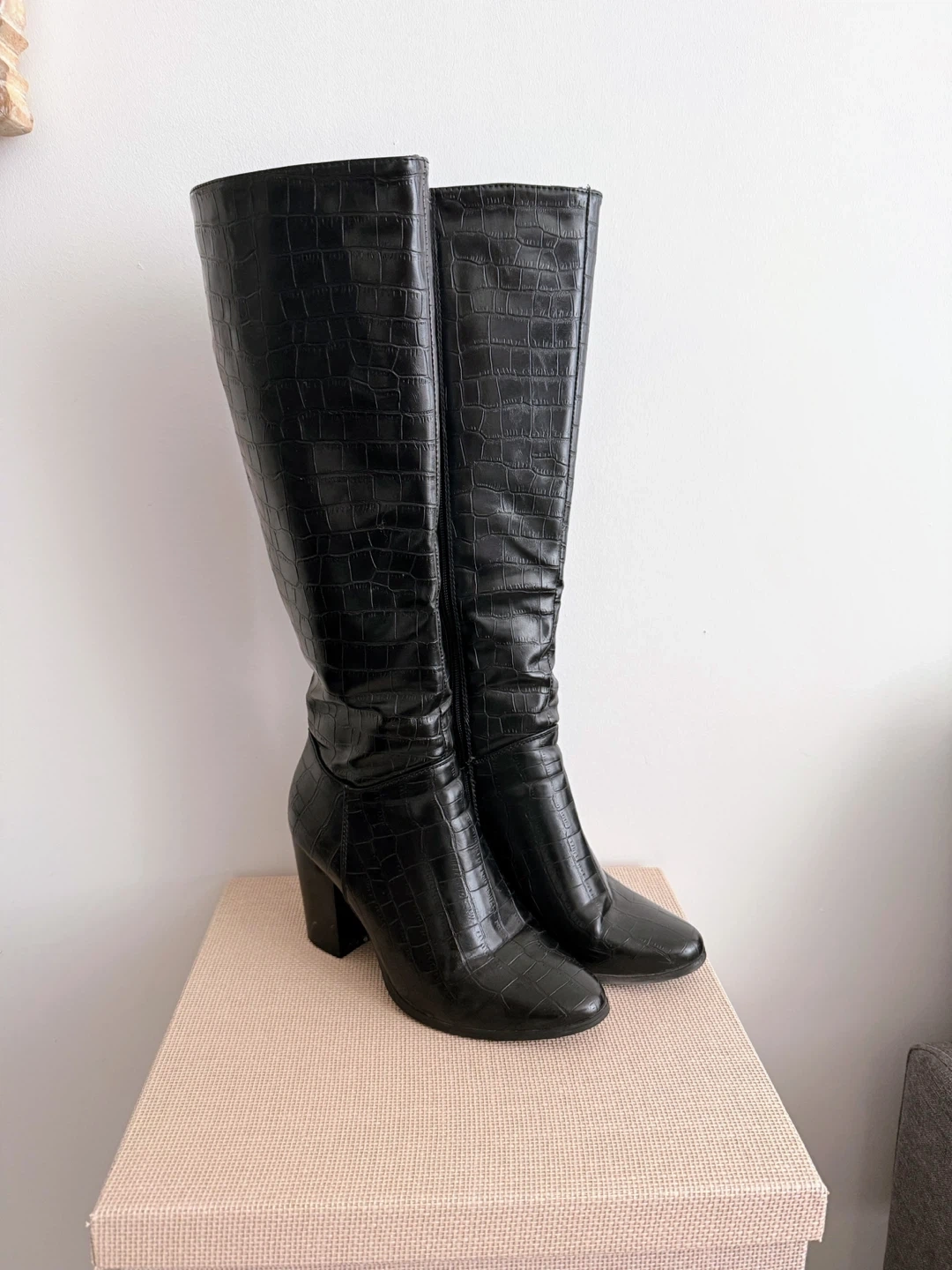 73Black patent faux leather with crocodile pattern Inner zipper Block heel Soft rounded toe Elastic at the top for stretch Super comfortable Great condition