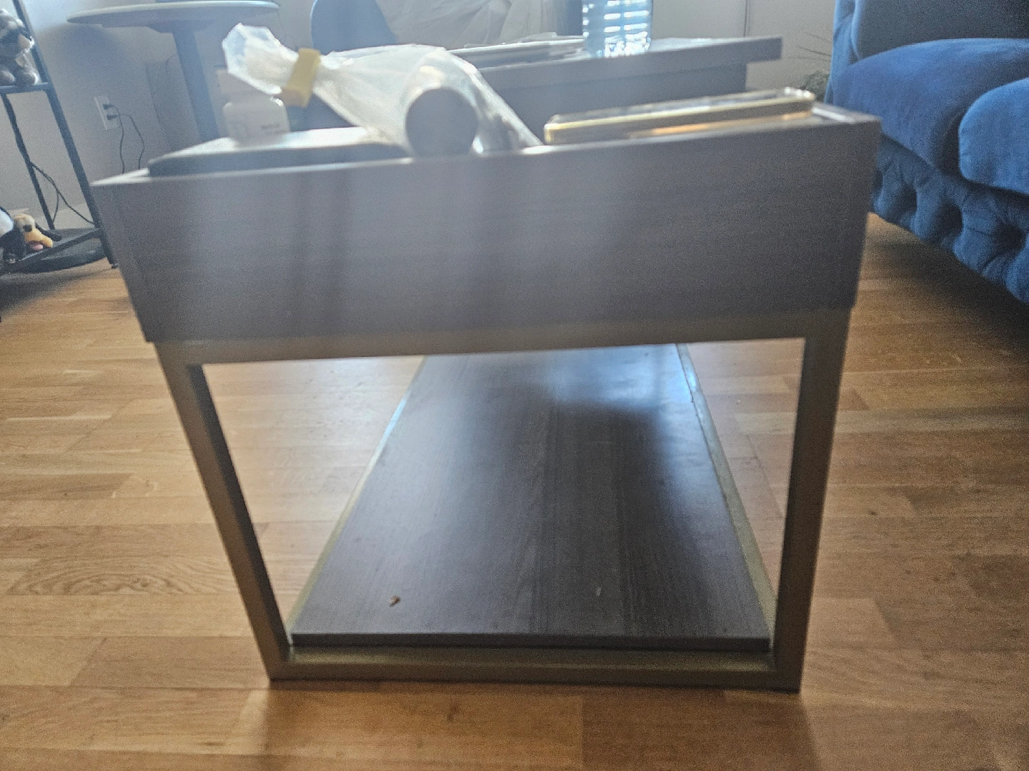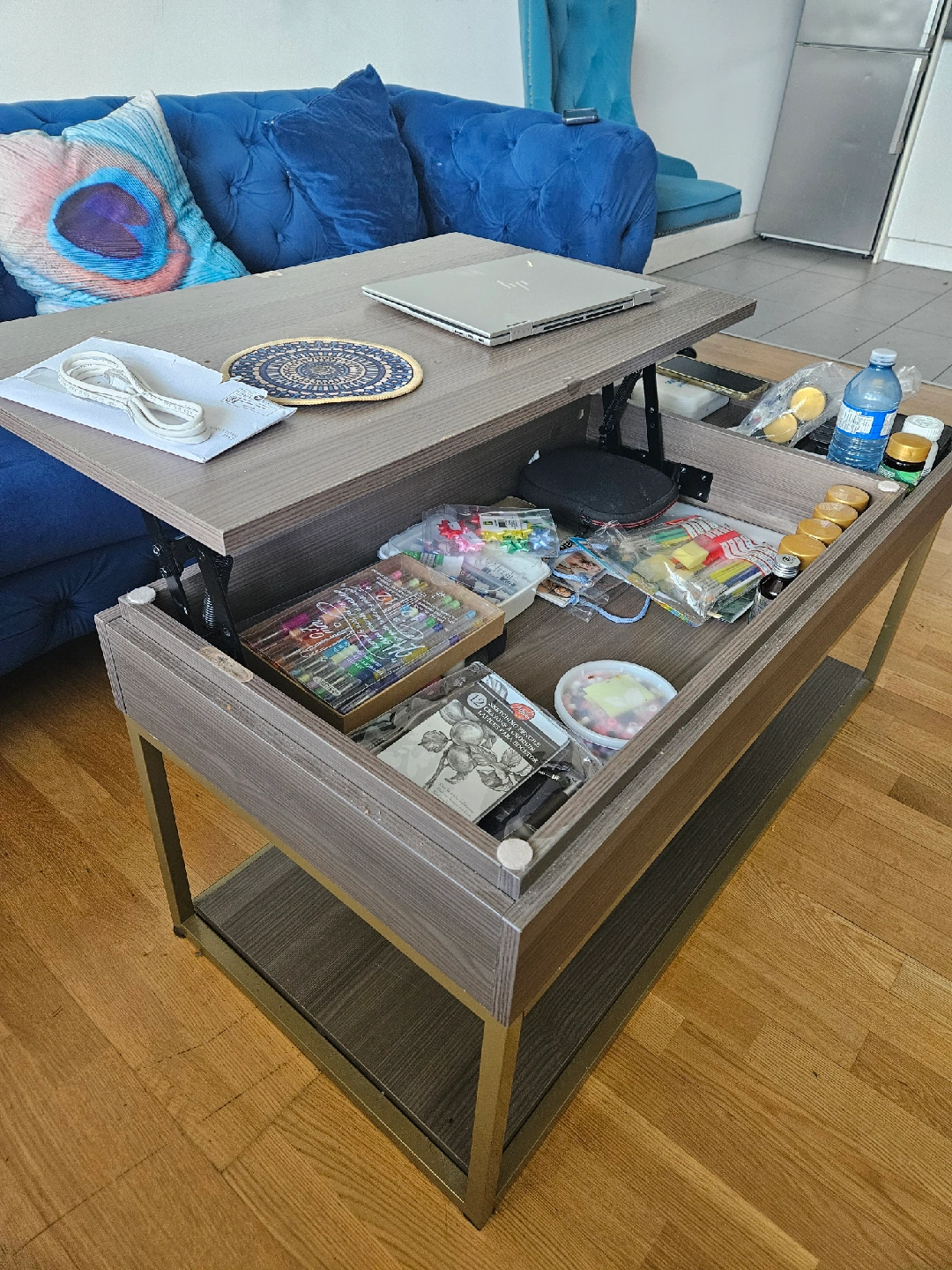 Coffee table with a lift top. Great for working from home or eating in front of the TV! It has a roomy storage space inside for all your bits and bobs