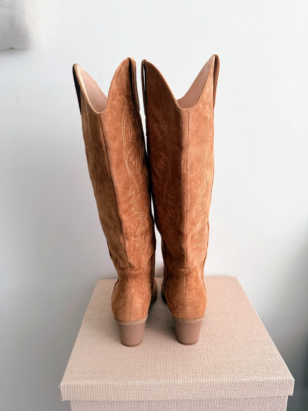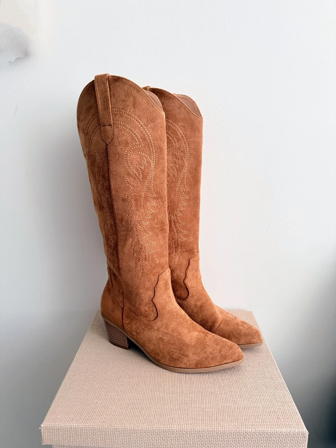 73Light brown faux suede full length cowboy boots Soft fabric with detailed stitching Super comfortable