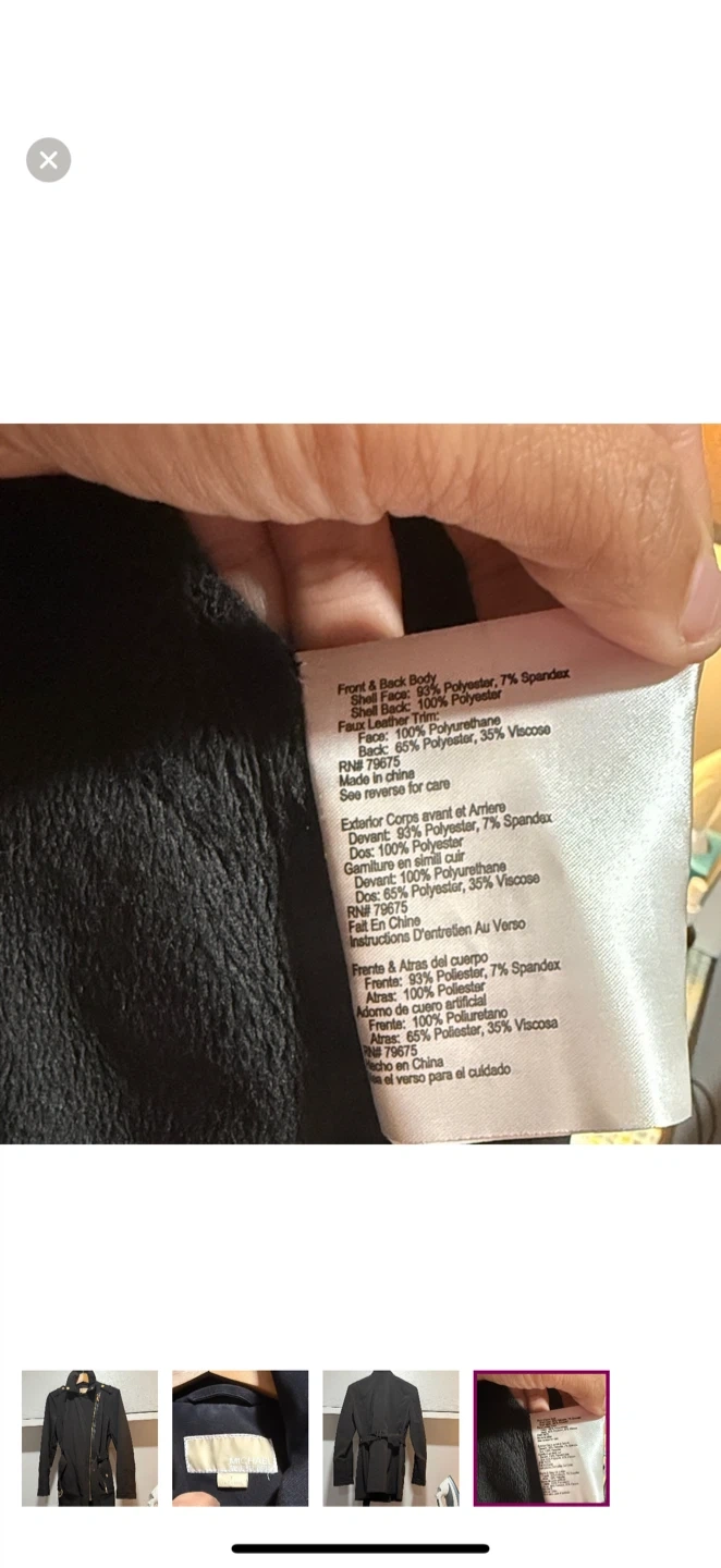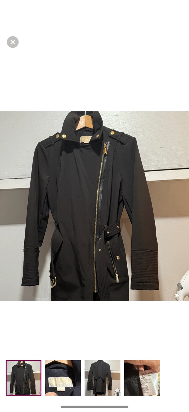 Selling a stylish black belted jacket from Michael Kors in size M! It's in great condition and features a sleek design with gold accents. The outer shell is made of 100% polyurethane, while the lining is a blend of polyester and viscose. Perfect for adding a touch of sophistication to any outfit.