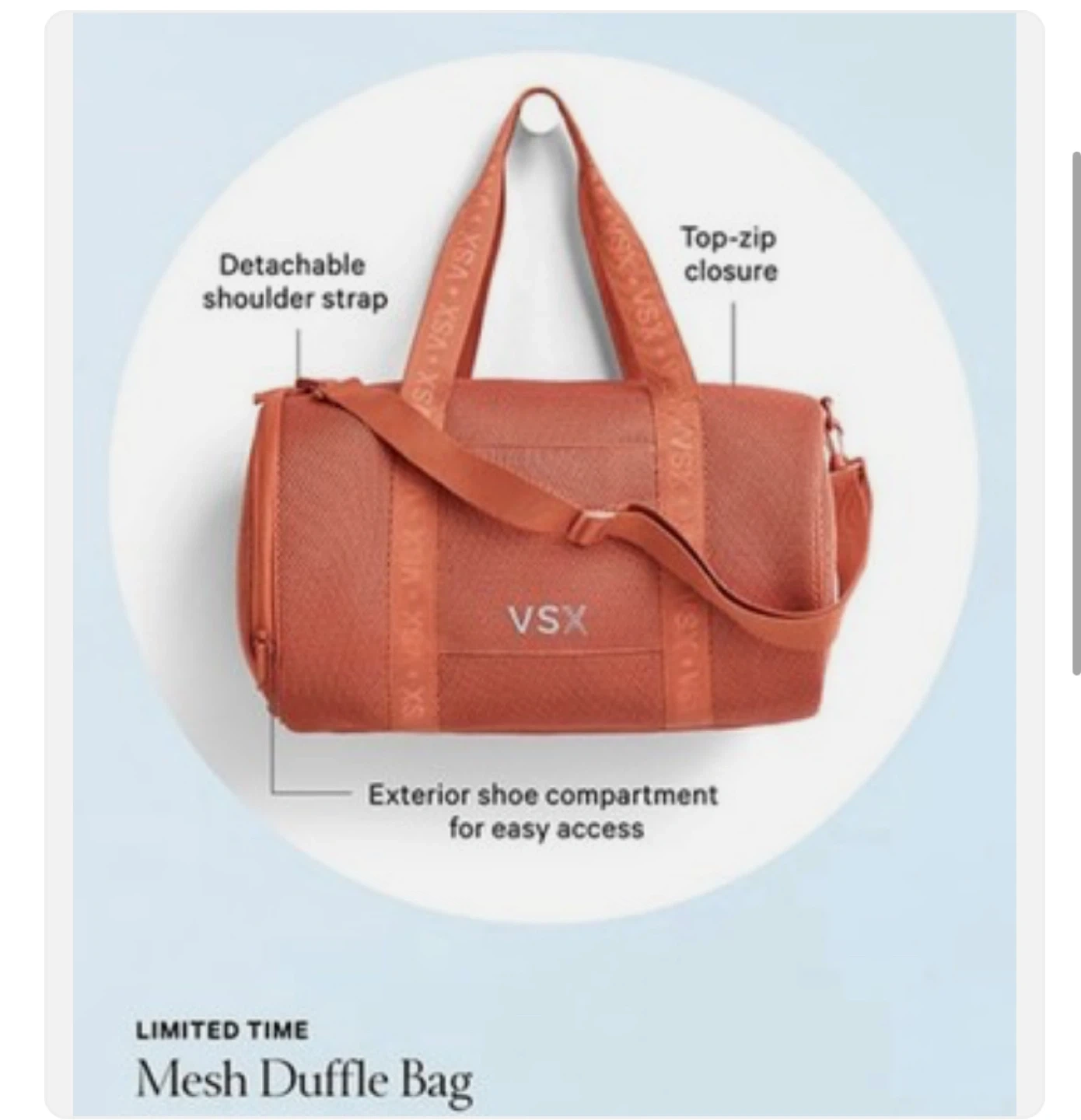 Selling a VSX mesh duffle bag! It has a detachable shoulder strap and a top-zip closure. There's also an exterior shoe compartment for easy access. Perfect for the gym or a weekend getaway Retail price: 89$