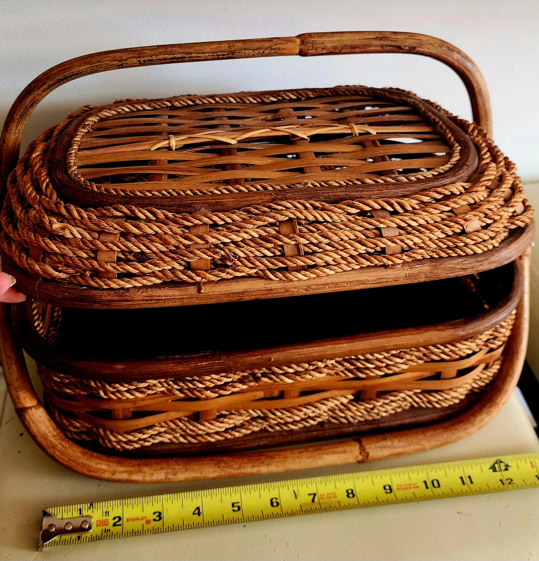 Selling a wicker basket with a handle. It's in good condition and perfect for storage. The basket has a hinged lid and a sturdy wooden base.