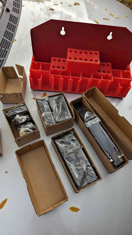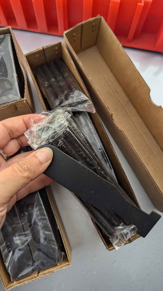 Brand-new T-slot clamping kit for milling machines, drill presses, or CNC tables. Includes all studs, nuts, step blocks, and clamp plates with red storage rack.