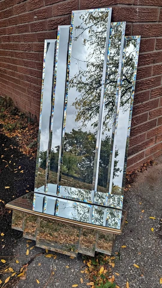Striking 1980s Art Deco revival mirror with shelf, tiered skyscraper silhouette and beveled glass panels.
