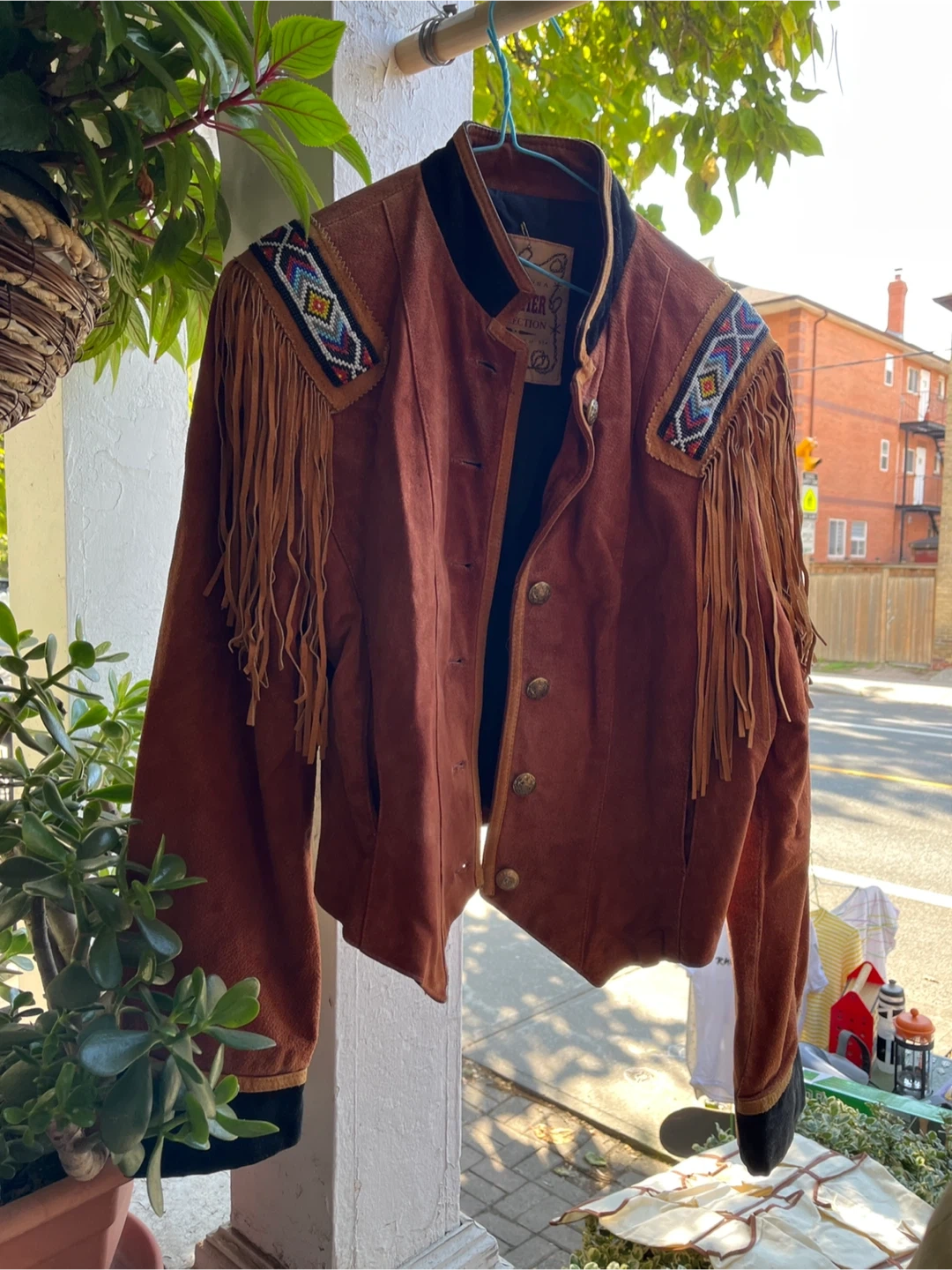 The jacket features a unique design with beaded accents on the shoulders and classic western-style fringe.