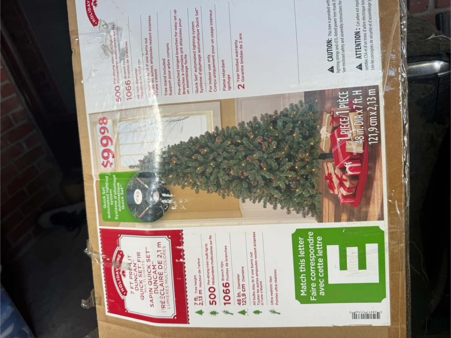 Selling a 7ft Holiday Time Duncan Fir Quick Set artificial Christmas tree. It has 500 multicoloured lights and 1066 branch tips. The tree height is 2.13 m and the diameter is 48 inches. Originally bought for $99.98