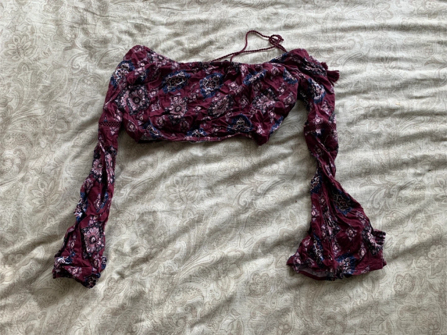 Cute Forever 21 crop top with a floral pattern! It's a size small and features long, bell sleeves. Great for a night out or a casual summer day!