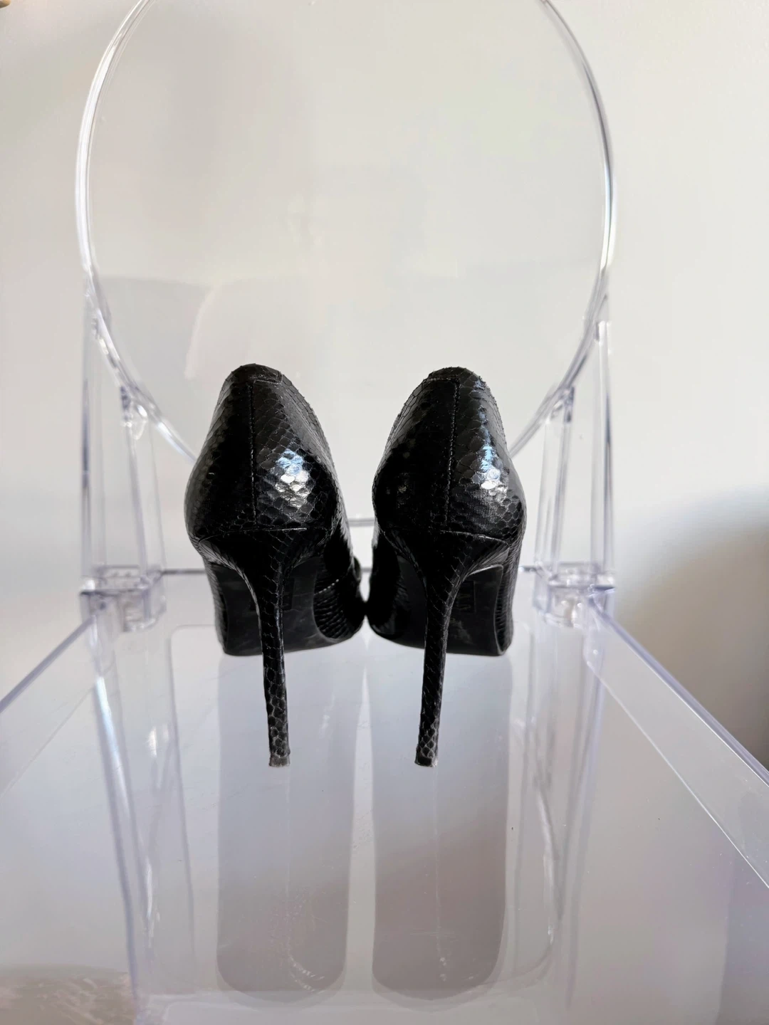 73Le Chateau Black patent faux leather with snake skin texture Pointed toe Stiletto heel Some wear on inside but great condition outside