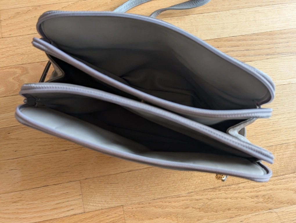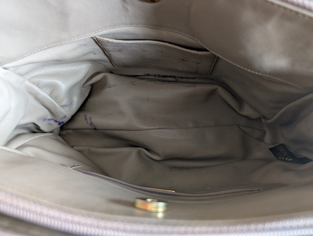 Selling a Talbots leather shoulder bag. It's a light grey colour with gold hardware and a quilted pattern on the front. The inside has some stains and pen marks, as shown in the photos.