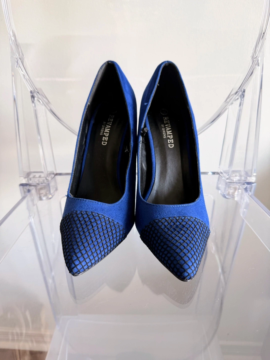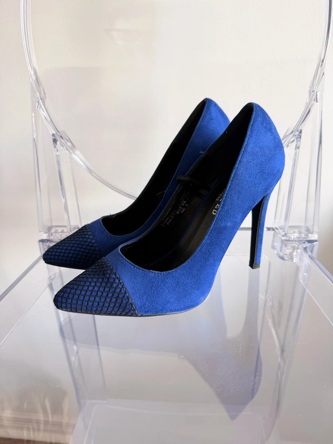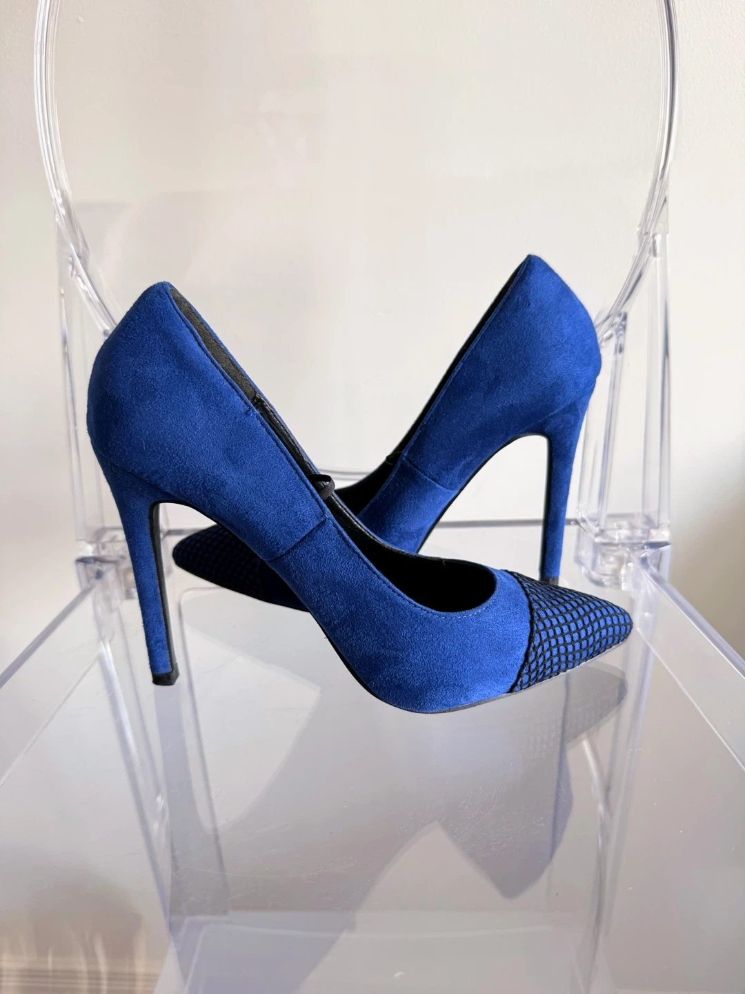 73Royal blue faux suede Black mesh toe detail Stiletto heel pointed toe Never worn