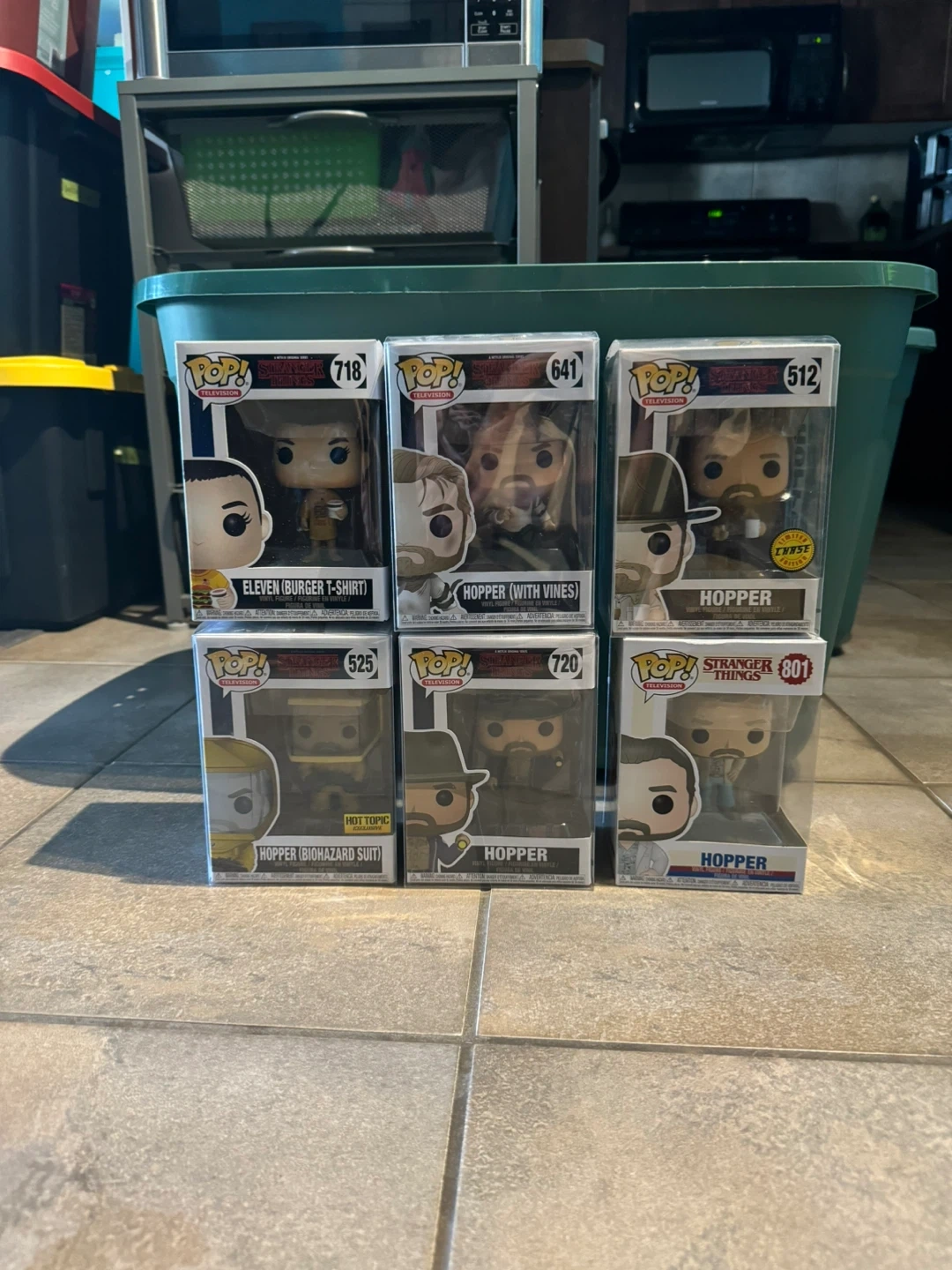 25Selling a collection of Funko Pop figures from the Stranger Things series! Included are: - Eleven (Burger T-Shirt) #718 - Hopper (With Vines) #641 - Hopper #512 - Hopper (Biohazard Suit) #525 (Hot Topic Exclusive) - Hopper #720 - Hopper #801 These figures are in great condition and come in their original boxes