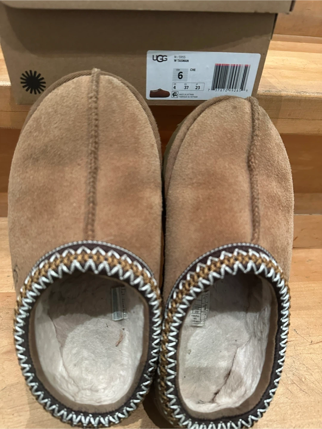 Selling a pair of UGG Tasman slippers in size 6. They come with the original box! These cozy slippers are perfect for keeping your feet warm and comfortable around the house. The classic design and quality materials make them a stylish and practical choice for everyday wear