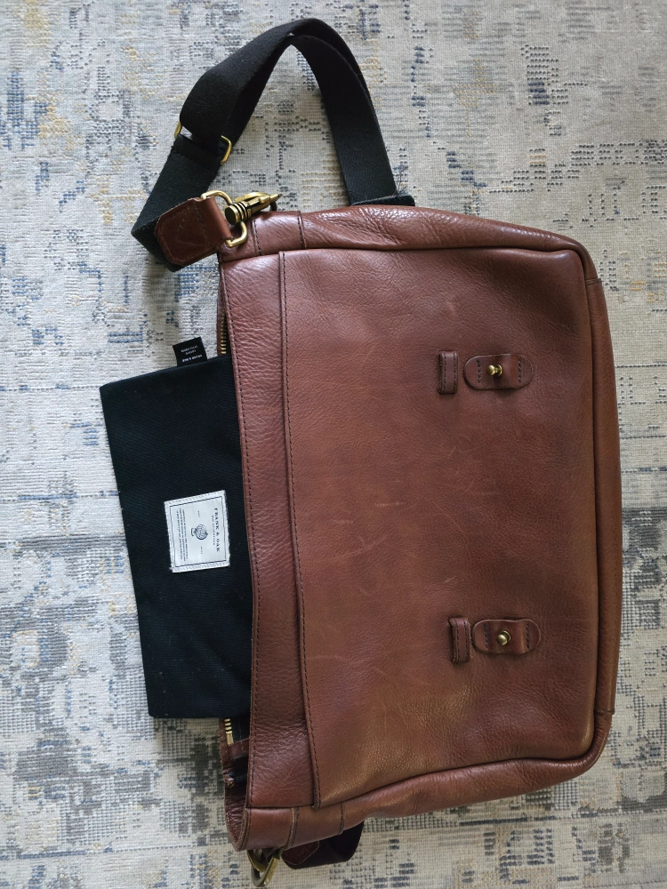 Selling a gently used Frank and Oak messenger bag in brown leather. It's in great shape and perfect for carrying your laptop and other essentials. The bag features a shoulder strap for easy carrying and a classic design that will never go out of style