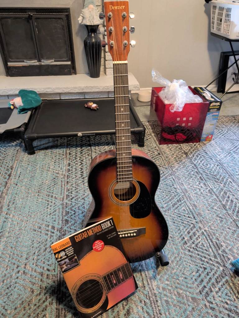 Selling a Denver 3/4 size acoustic guitar, perfect for children, beginners or anyone looking for a reliable instrument! It comes with the Hal Leonard Guitar Method Book 1, Deluxe Beginner Edition, so you can start learning right away. Great for kids looking to pick up a new hobby. Comes with stand.