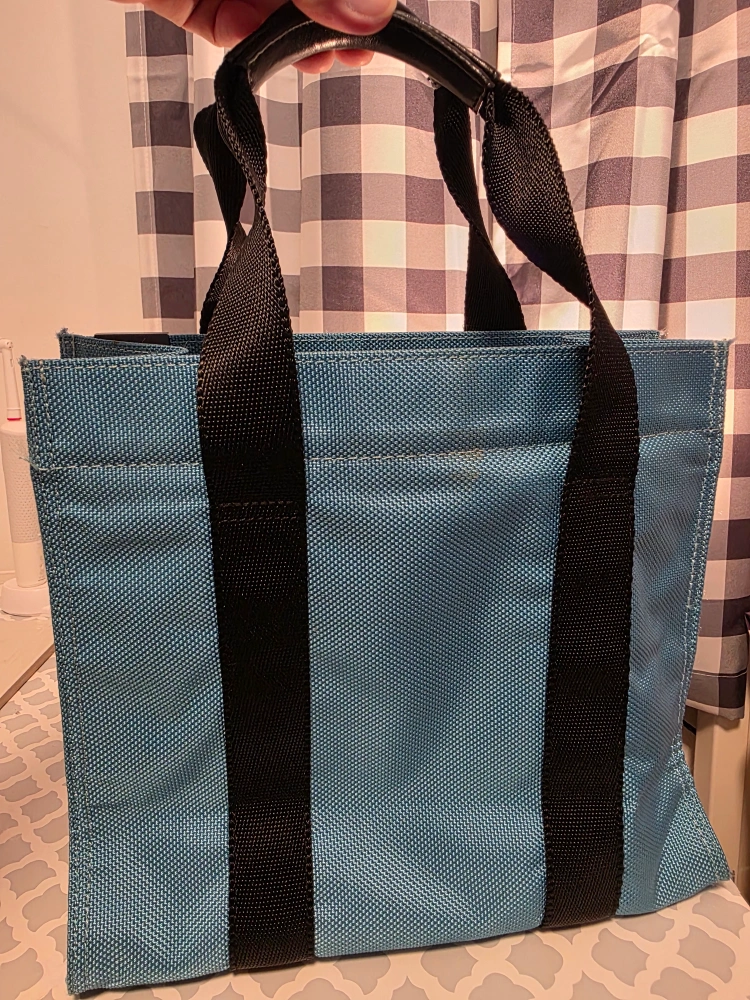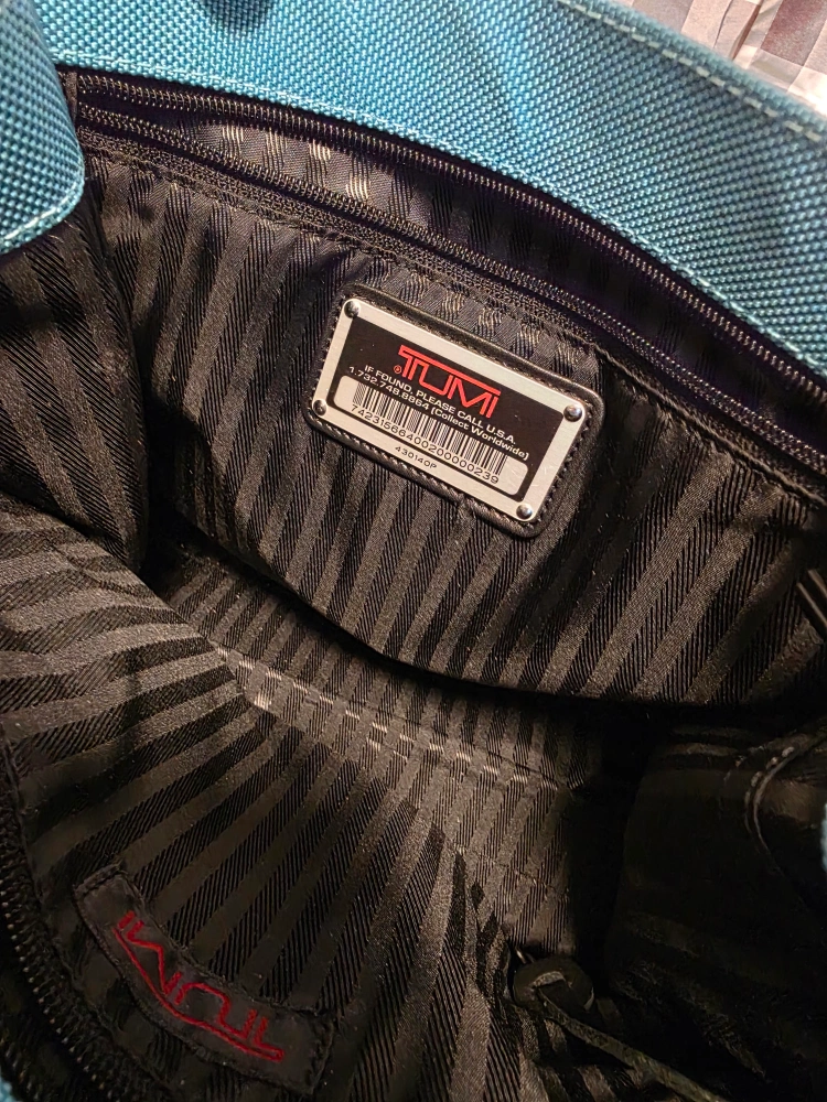 Selling a TUMI tote bag in a lovely teal colour! It features black handles and 2 zippered inside pocket. Great for everyday use or travel. Small flat pouch inside is missing.