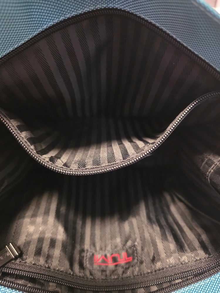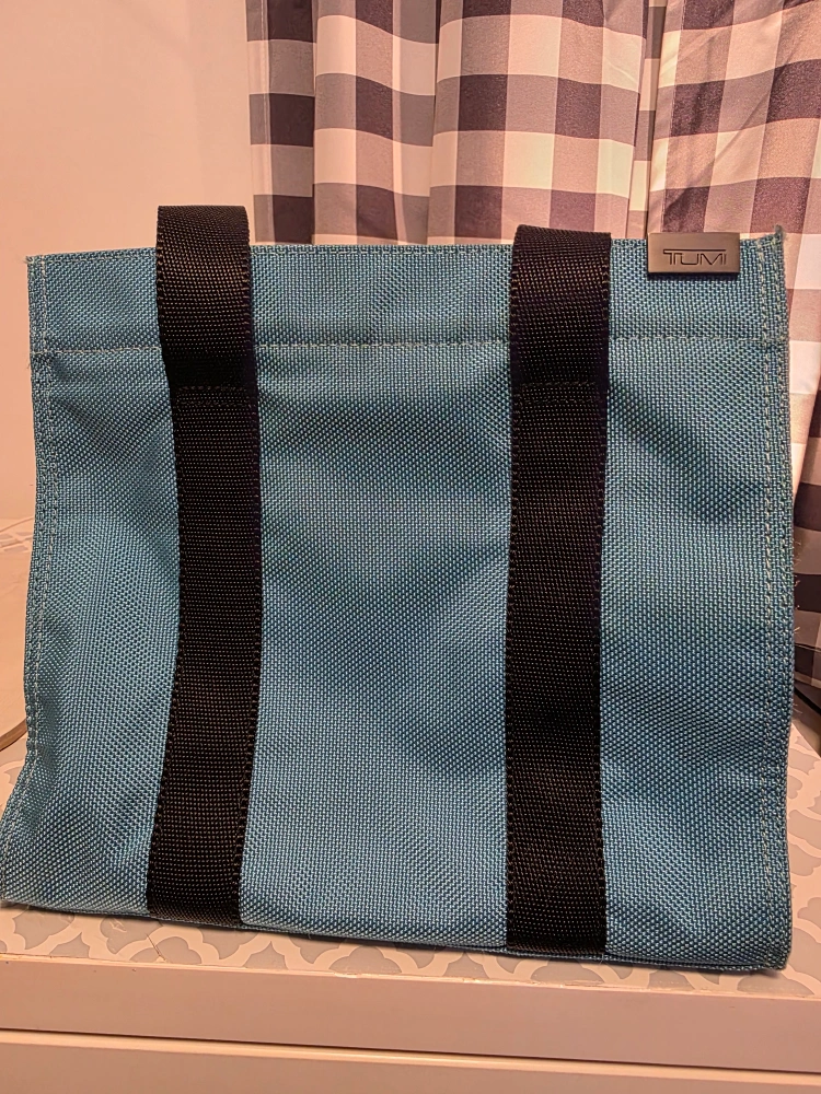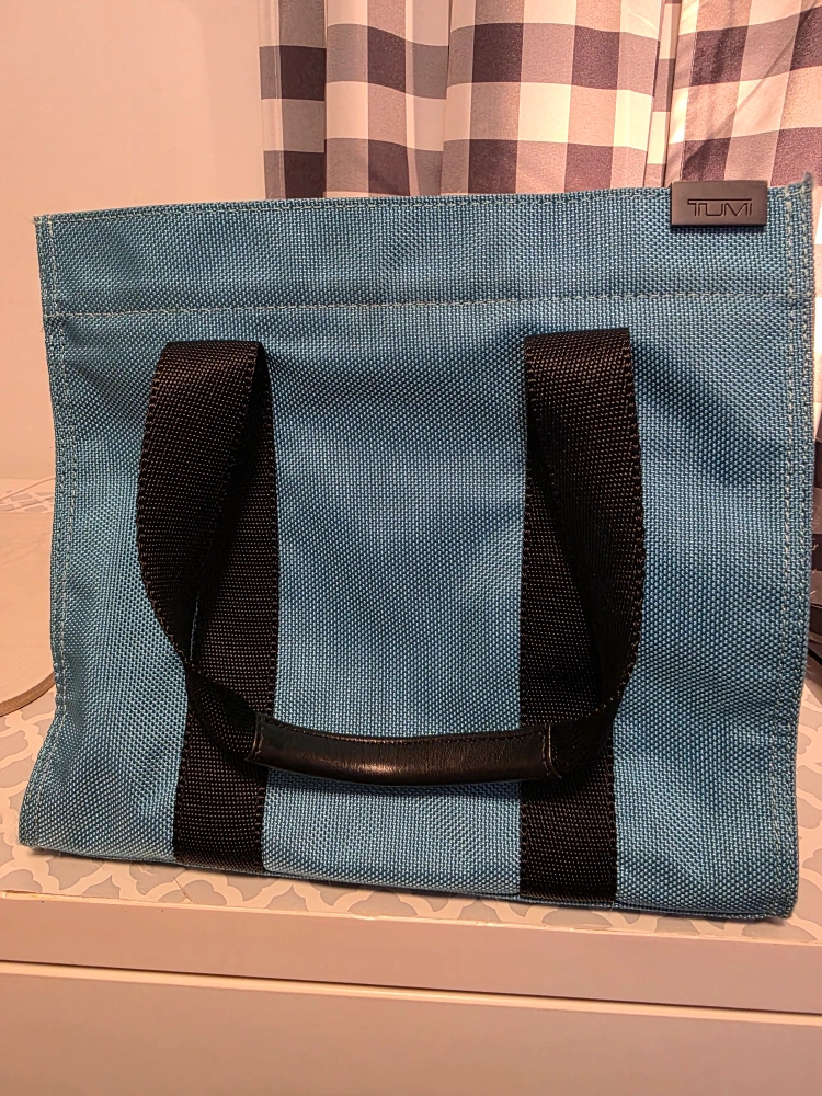 Selling a TUMI tote bag in a lovely teal colour! It features black handles and 2 zippered inside pocket. Great for everyday use or travel. Small flat pouch inside is missing.